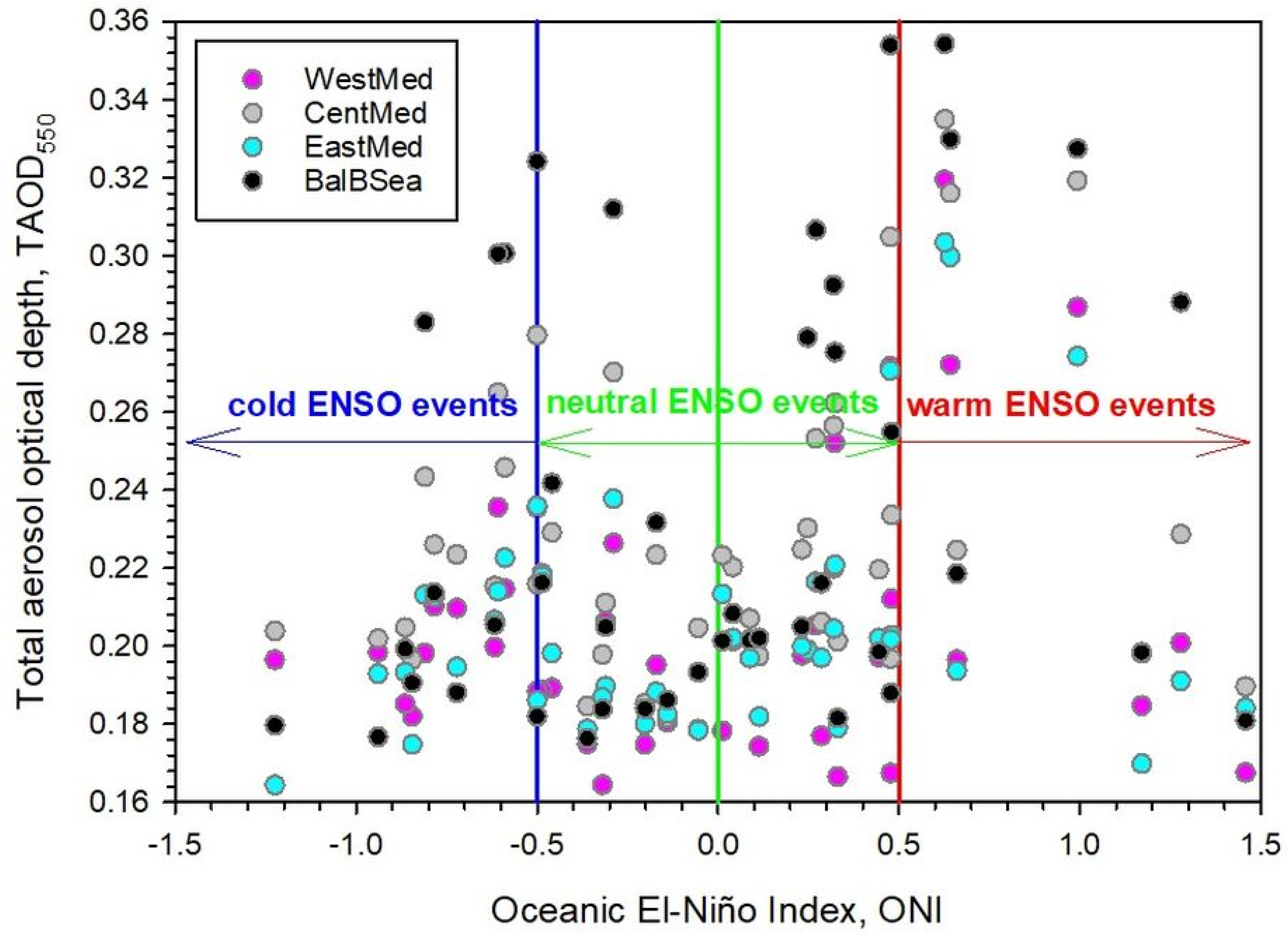 - The El Niño–Southern Oscillation (through ONI) influences all aerosol parameters mentioned above.