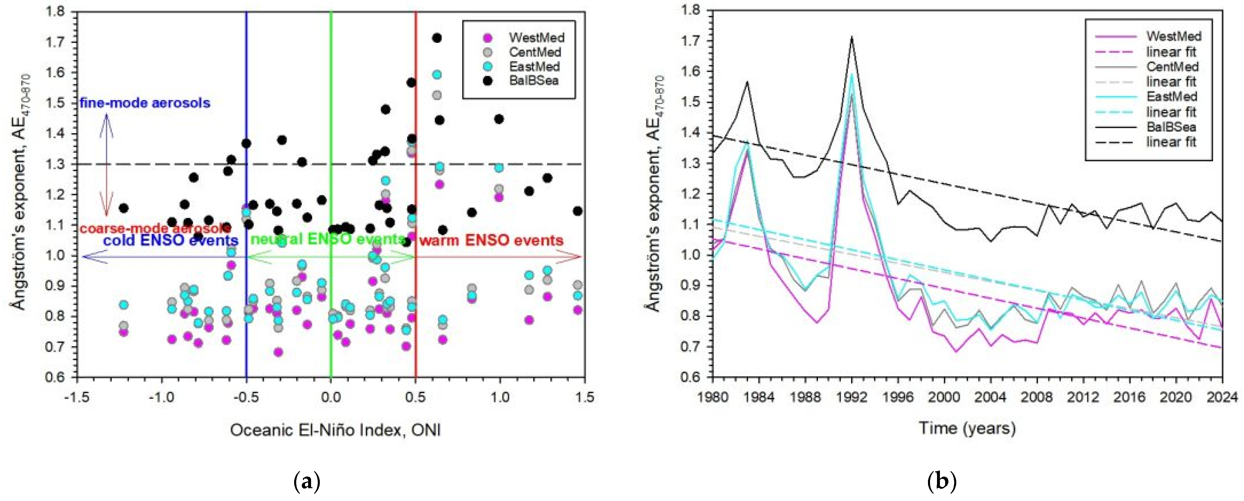 - Regardless of the ENSO phase, all AE470–870 values indicate coarse-mode particles across the Mediterranean on a yearly basis. Fine-mode aerosols are linked to only two years: 1983 and 1992, related to the volcanic eruptions of Mt. El Chichón and Mt. Pinatubo, respectively.