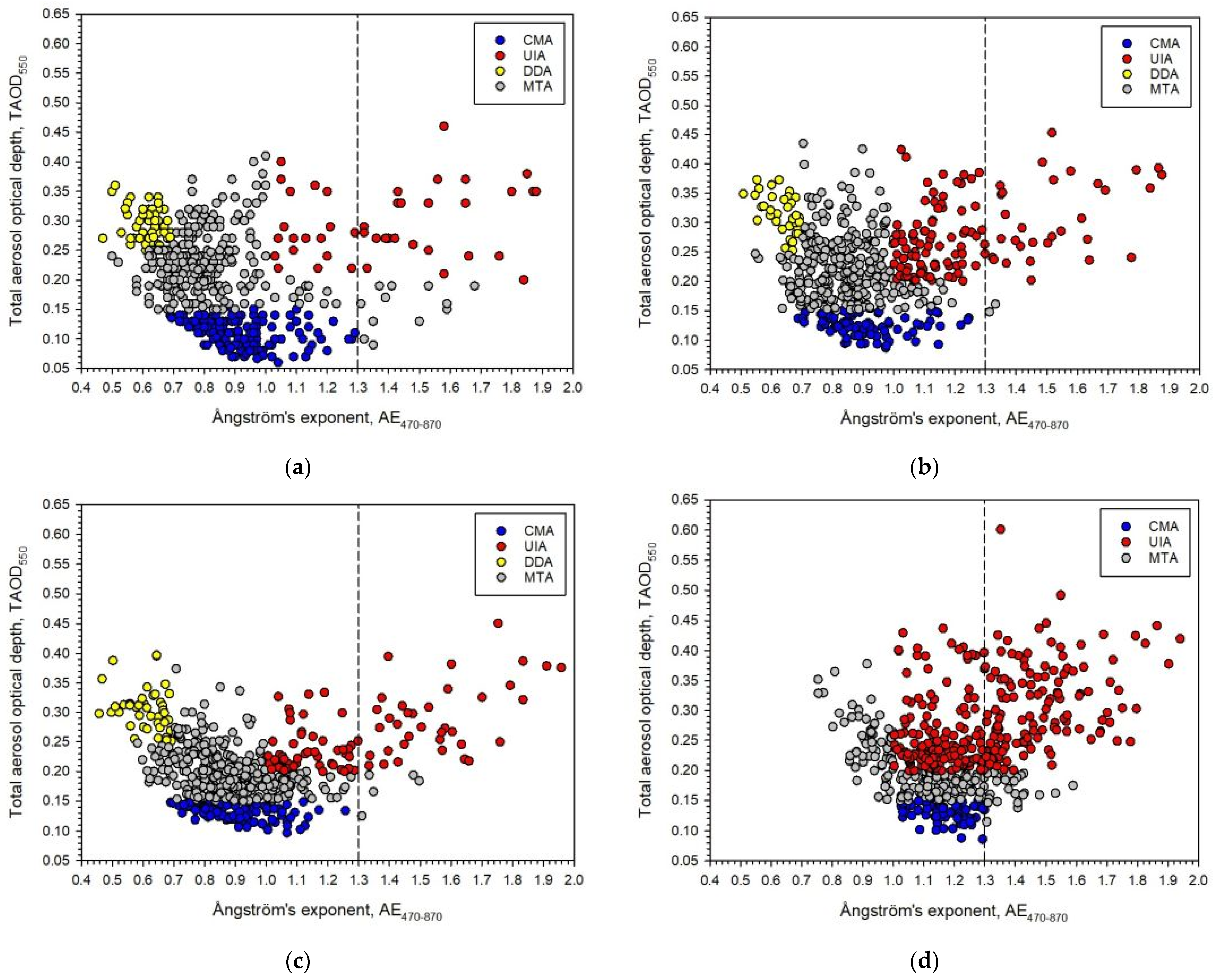 - In contrast, the DDAOD550, StAOD550, and AE470–870 parameters exhibit a declining, rising, and increasing trend, respectively, from WestMed to BalBSea. This suggests that the overall particle sizes of the aerosols of volcanic debris and desert dust vary across the four Mediterranean subregions. While stratospheric aerosols appear to finally influence the Balkan peninsula and Black Sea area more (see Figure 4 and µ in Table 5), desert-dust outbreaks from the Sahara Desert dominate the West Mediterranean [100]. According to AE470–870, fine-mode aerosols gradually take over from WestMed to BalBSea (see Figure 10a and µ’s in Table 5).