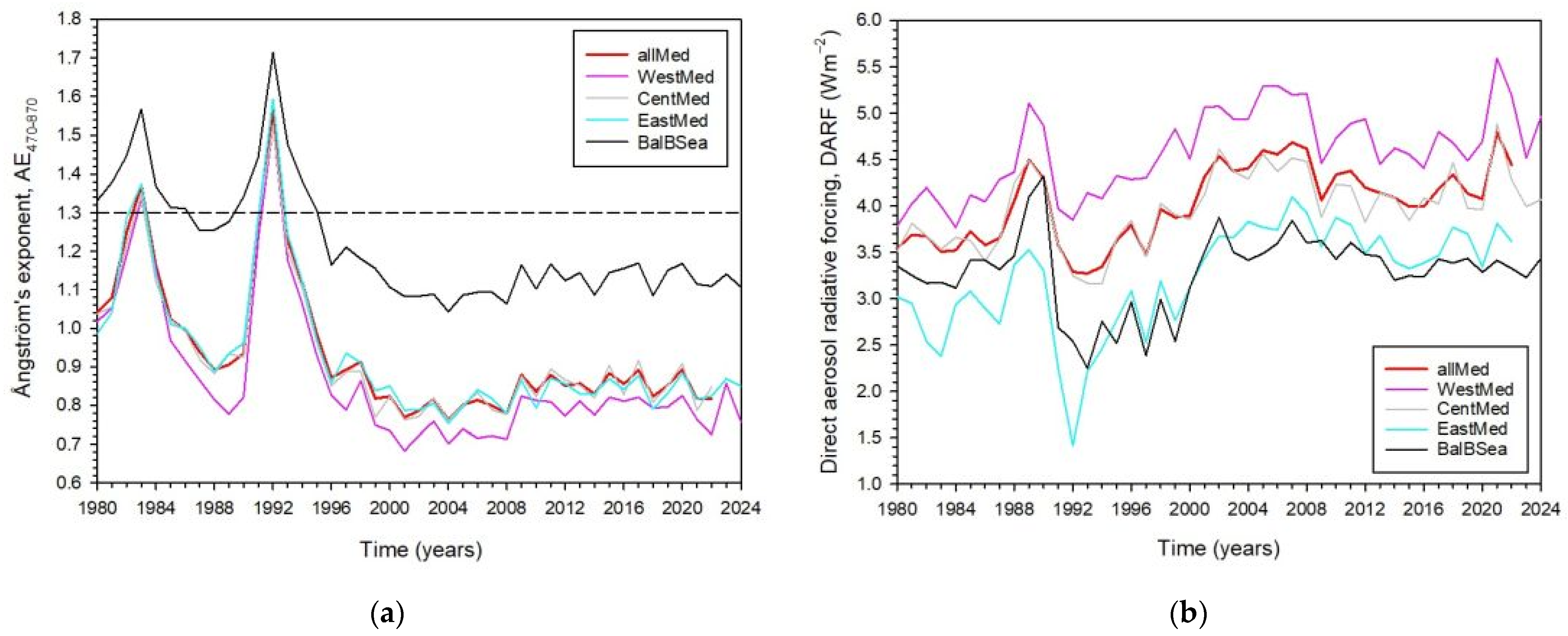 - In an old study, Dutton et al. [96] examined TAOD500 at the Mauna Loa Observatory (MLO, 19.54° N) and found that the maximum values of the parameter were 0.28 and 0.23 from the El Chichón (1982) and Pinatubo (1991) eruptions, respectively. These values are comparable with the peaked values in Figure 2a–d of the present study. Indeed, the maximum annual TAOD550 values for the El Chichón and Pinatubo eruptions are 0.289 and 0.319 (WestMed), 0.319 and 0.335 (CentMed), 0.274 and 0.303 (EastMed), and 0.354 and 0.354 (BalBSea), respectively. These higher maximum values are due to the fact that the MLO is located on the remote island of Hawaii, thus recording the background aerosol loading in the atmosphere. Similar observations to those at the MLO were made at some Antarctic stations by Herber et al. [97]. Sato et al. [80], in a study to investigate the stratospheric aerosol loading from volcanic eruptions in the period 1850–1990, found that El Chichón mostly affected regions in the northern hemisphere at latitudes 0° N–30° N just after its eruption in March/April 1982, and regions at latitudes 60° N–90° N at the end of the year; one can remark that these low-latitude areas in the northern hemisphere include most of the broader region of the Mediterranean in this study, which were affected by those eruptions (see Figure 3, Figure 4, Figure 11b and Figure 13a). A similar study by Long and Stowe [98] about the Pinatubo eruption found that the stratospheric aerosol loading was particularly high over areas with latitudes 20° S–20° N just after its eruption in June 1991. This confirms the lower TAOD550 values recorded at MLO due to the Pinatubo eruption in comparison to those over the four Mediterranean subregions (see Figure 3, Figure 4, Figure 11b and Figure 13a). A recent work by Toohey and Sigl [99] reconstructed StAODs in the period from 500 BC to 1900 AD; they found peak StAOD550 values ranging between 0.2 and 0.4, quite comparable to the two peaks shown in Figure 2 in the four Mediterranean subregions due to the El Chichón and Pinatubo eruptions.