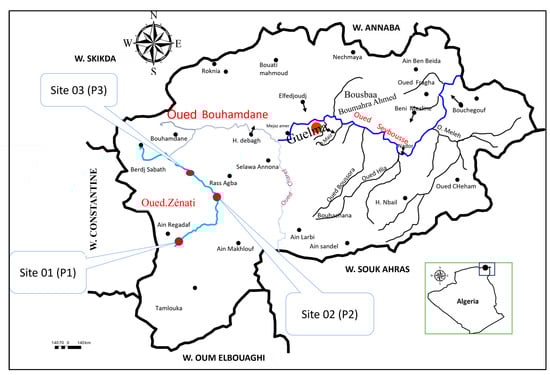 Map of the study area showing the location of the three sampling sites (P1, P2, and P3) along the Oued–Zénati waterway.