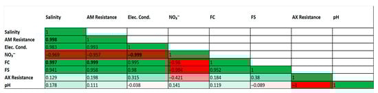 Conversely, strong negative correlations were identified, notably a perfect negative correlation between pH and amoxicillin/clavulanic acid (AX) resistance (r = −1.000, p < 0.05), and between electrical conductivity and nitrate concentrations (r = −0.999, p < 0.05). Consistent with the exploratory nature of this analysis (based on n = 3 sites), these high correlation coefficients are interpreted with extreme caution and are not considered evidence of a direct causal relationship.