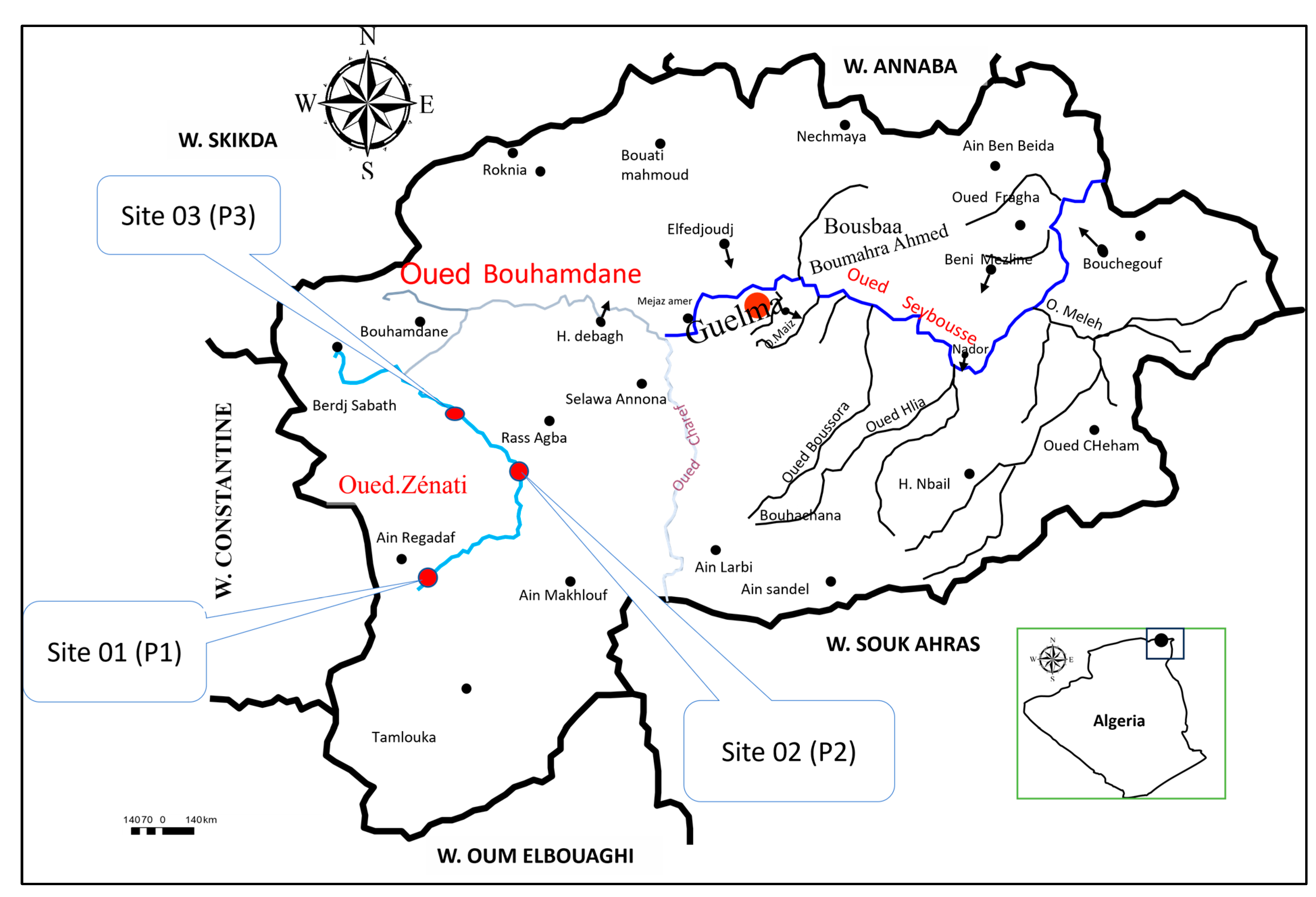 | P2 | Direct Impact | 36°21′18″ N, 7°07′51″ E | Untreated domestic and hospital wastewater; artisanal industrial runoff. | Point of maximum contamination; influenced by the City of Oued–Zénati (>50,000 inhabitants). |