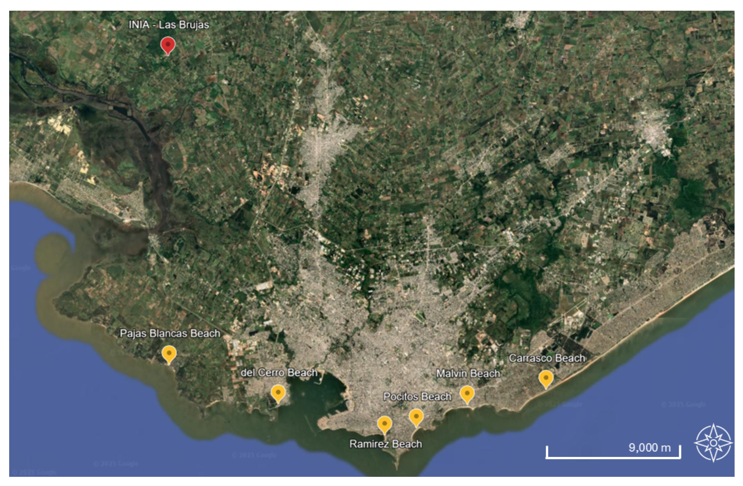 Figure 1 shows the locations of the beaches selected for this study along the Montevideo coastline.