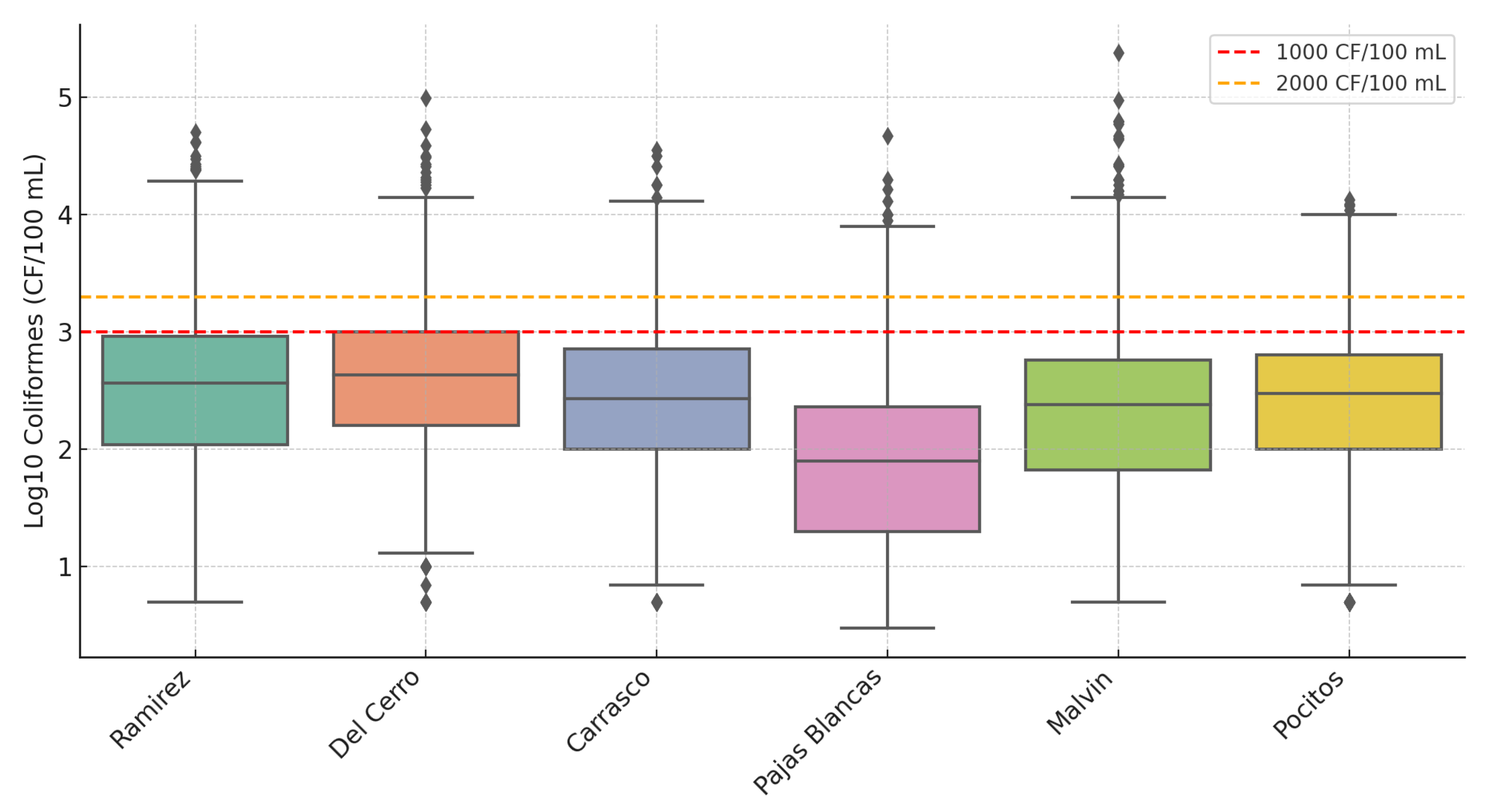 Figure 4, the boxplot of Log-transformed thermotolerant coliform concentrations is presented for each selected beach. To contextualize these results, we compare the observed values with Uruguay’s bathing water quality standards established by the Ministry of Environment. According to national regulations (Decree No. 253/79 and its amendments, RM s/n of 25 February 2005, and the Gesta Agua proposal) [