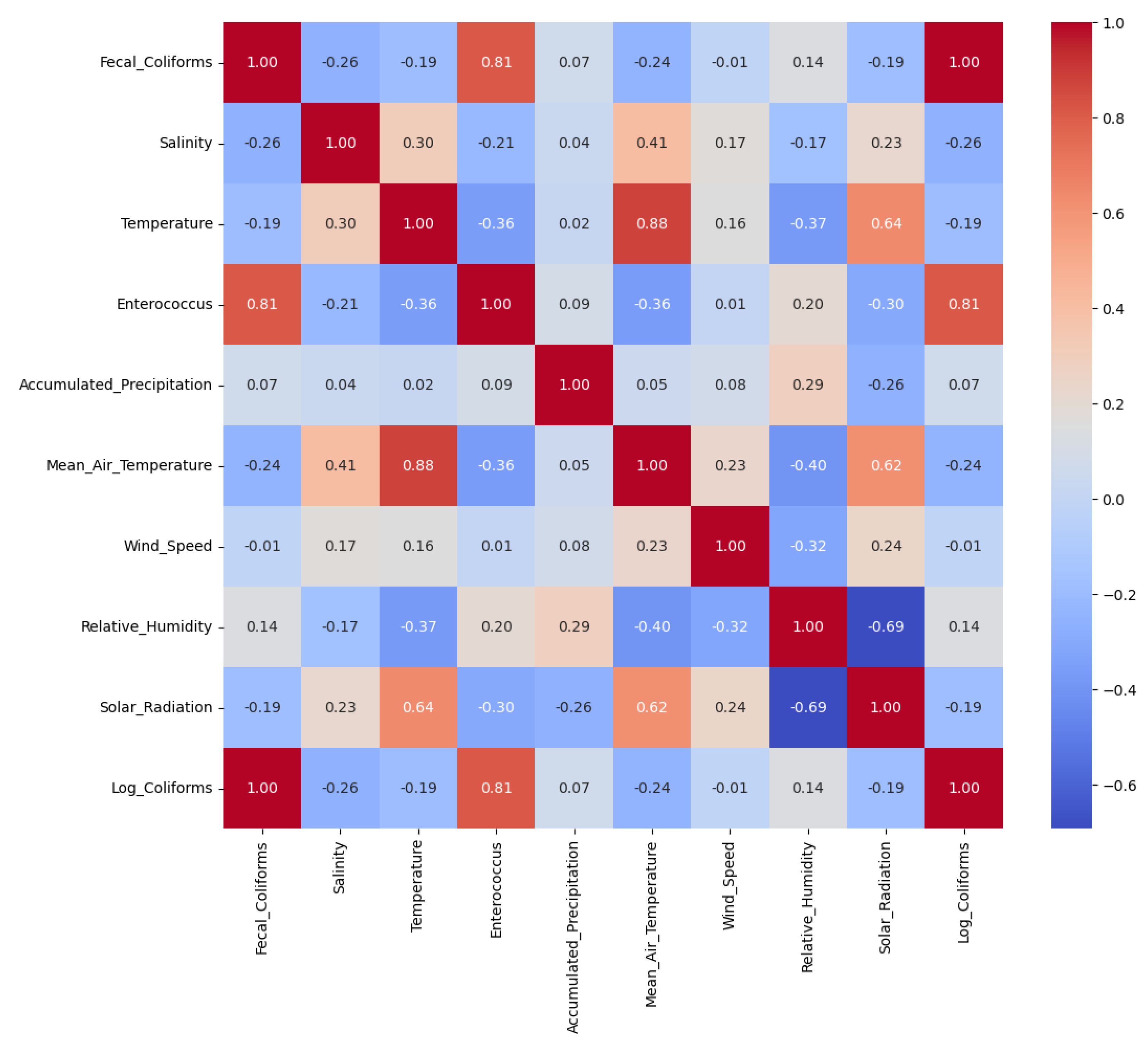 Figure 5). A strong positive correlation was observed between fecal coliforms and enterococcus (Spearman = 0.813; Kendall = 0.631), which is expected as both are fecal indicator bacteria commonly used to assess microbiological water quality. Their simultaneous increase typically reflects contamination from a shared source, such as combined sewer overflows or stormwater discharges carrying human or animal waste. Another noteworthy correlation was found between water and air temperatures (Spearman = 0.881; Kendall = 0.701). This is also consistent with physical expectations, as water temperature responds to atmospheric conditions. Warmer air temperatures tend to result in higher water temperatures, especially in shallow coastal environments, due to heat exchange and solar radiation. In addition, both air temperature and water temperature showed moderate to strong positive correlations with solar radiation (Spearman = 0.617 and 0.639, respectively). This is consistent with the expected energy balance dynamics, where increased solar radiation leads to surface warming of both air and water bodies. Conversely, a strong negative correlation was found between relative humidity and solar radiation (Spearman = −0.692), which can be explained by the typical inverse relationship between sunlight and moisture: sunnier conditions often coincide with drier air, especially during the daytime when solar radiation is at its peak.