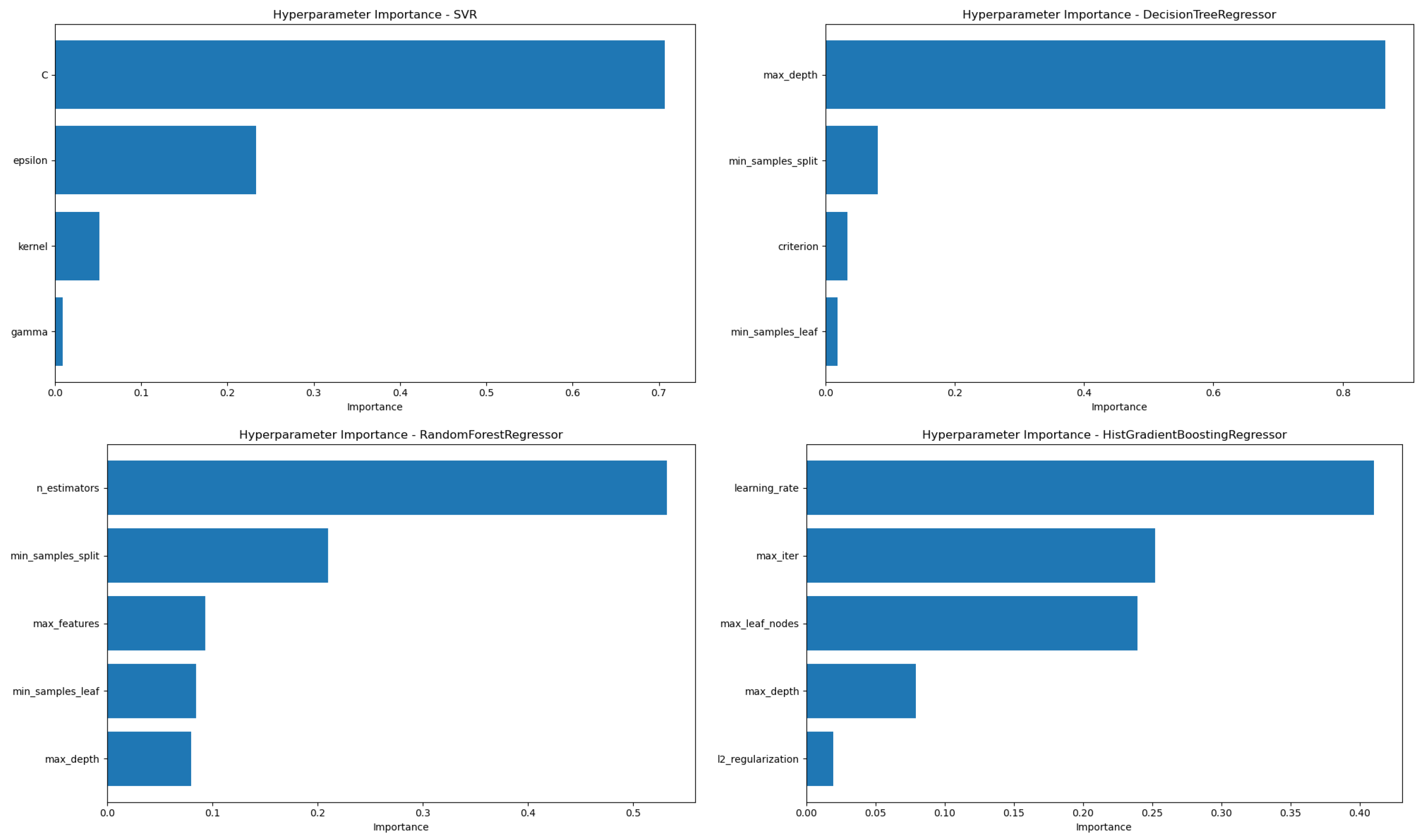 The analysis of hyperparameter importance revealed distinct patterns across models, reflecting the differing mechanisms by which each algorithm controls complexity and generalization. For the Support Vector Regressor (SVR), the regularization parameter C emerged as the most influential hyperparameter, significantly affecting model flexibility and the trade-off between bias and variance. The second most important was , which defines the width of the margin within which no penalty is given for errors, highlighting its role in controlling model tolerance to deviations. In the case of the Decision Tree Regressor (DT), the tree depth () has a significant impact on model performance, which aligns with its direct effect on model complexity and control of overfitting. For the Random Forest (RF) model, the number of estimators () had the most significant influence, likely because ensemble performance strongly depends on the number of trees used. Interestingly, was more important than , which had the least influence—perhaps due to sufficient depth being achieved early across trees, reducing the marginal gain of increasing depth further. Finally, in the HistGradient Boosting Regressor (HGB), proved to be the most critical, as it governs the contribution of each boosting step and thus heavily affects convergence. This was followed by and , both of which influence the model’s capacity to learn complex relationships while mitigating overfitting. These results highlight the importance of tuning model-specific parameters that most directly shape the learning dynamics and structural capacity of each algorithm.