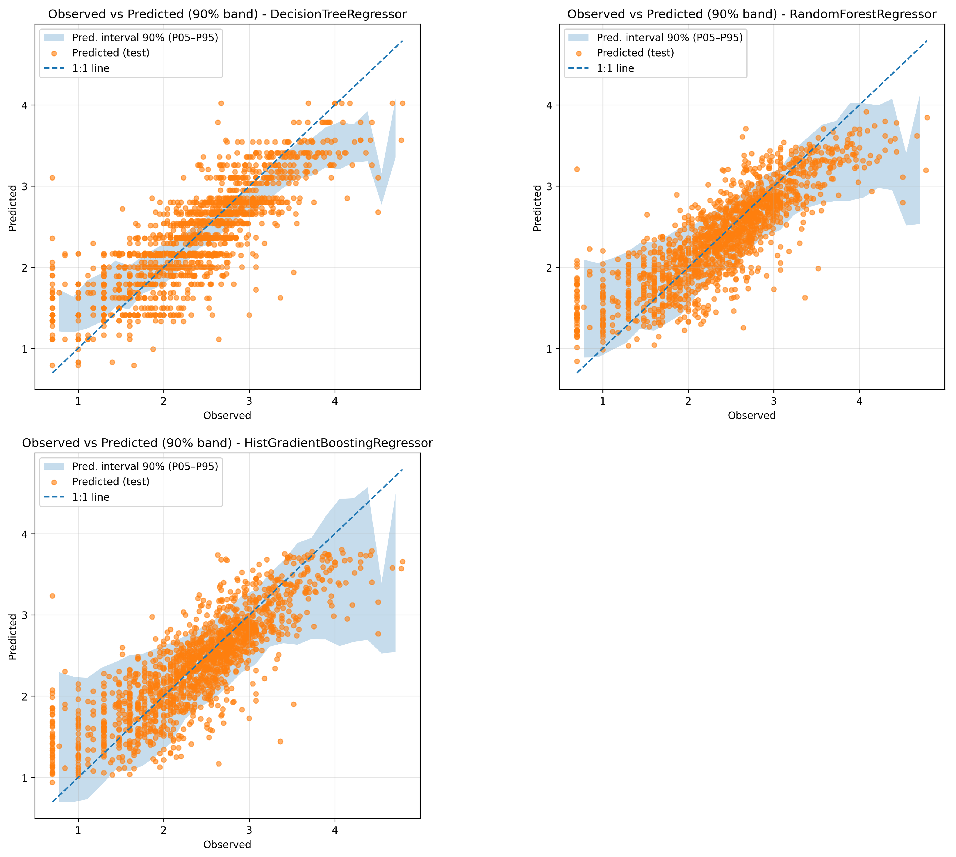 Figure 8 shows the scatter plots of observations vs. predictions for the three best models (Decision Tree, Random Forest, and HistGradient Boosting), including the corresponding 90% prediction intervals to illustrate model uncertainty.