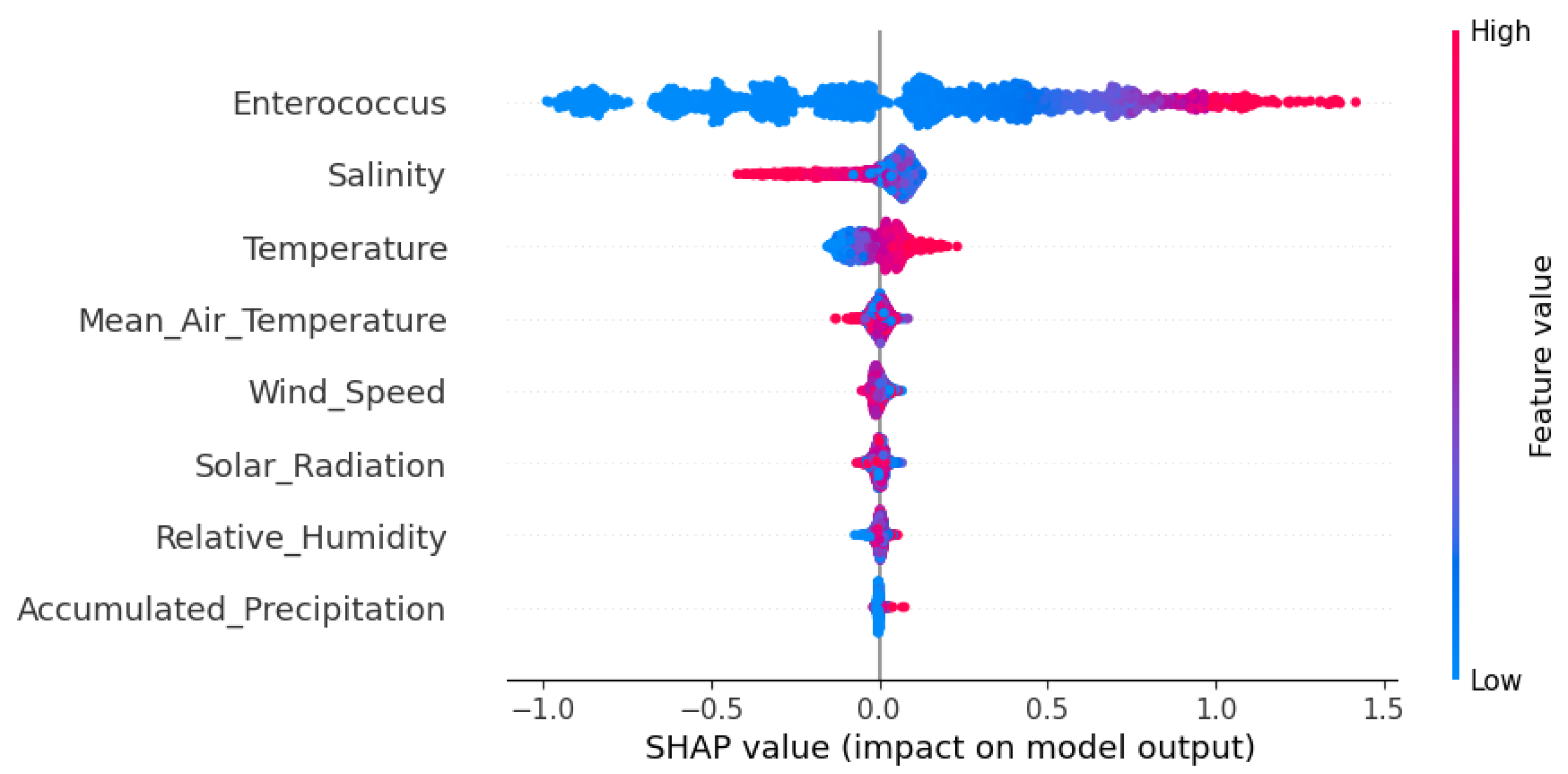 Interestingly, accumulated precipitation ranked as the least influential variable in the SHAP analysis. This result is somewhat unexpected, given the known role of rainfall in mobilizing fecal contaminants through surface runoff and combined sewer overflows. One possible explanation is that the precipitation monitoring station used in this study is located too far from the coastal sampling sites, and therefore may not accurately capture the localized rainfall events that influence water quality near the shoreline. Additionally, the temporal mismatch between rainfall events and sampling times, especially if peak contamination occurs shortly after rainfall and is not consistently captured during regular sampling, could reduce the apparent influence of precipitation in the model. These limitations underscore the need to enhance the spatial and temporal resolution of rainfall data for future studies.