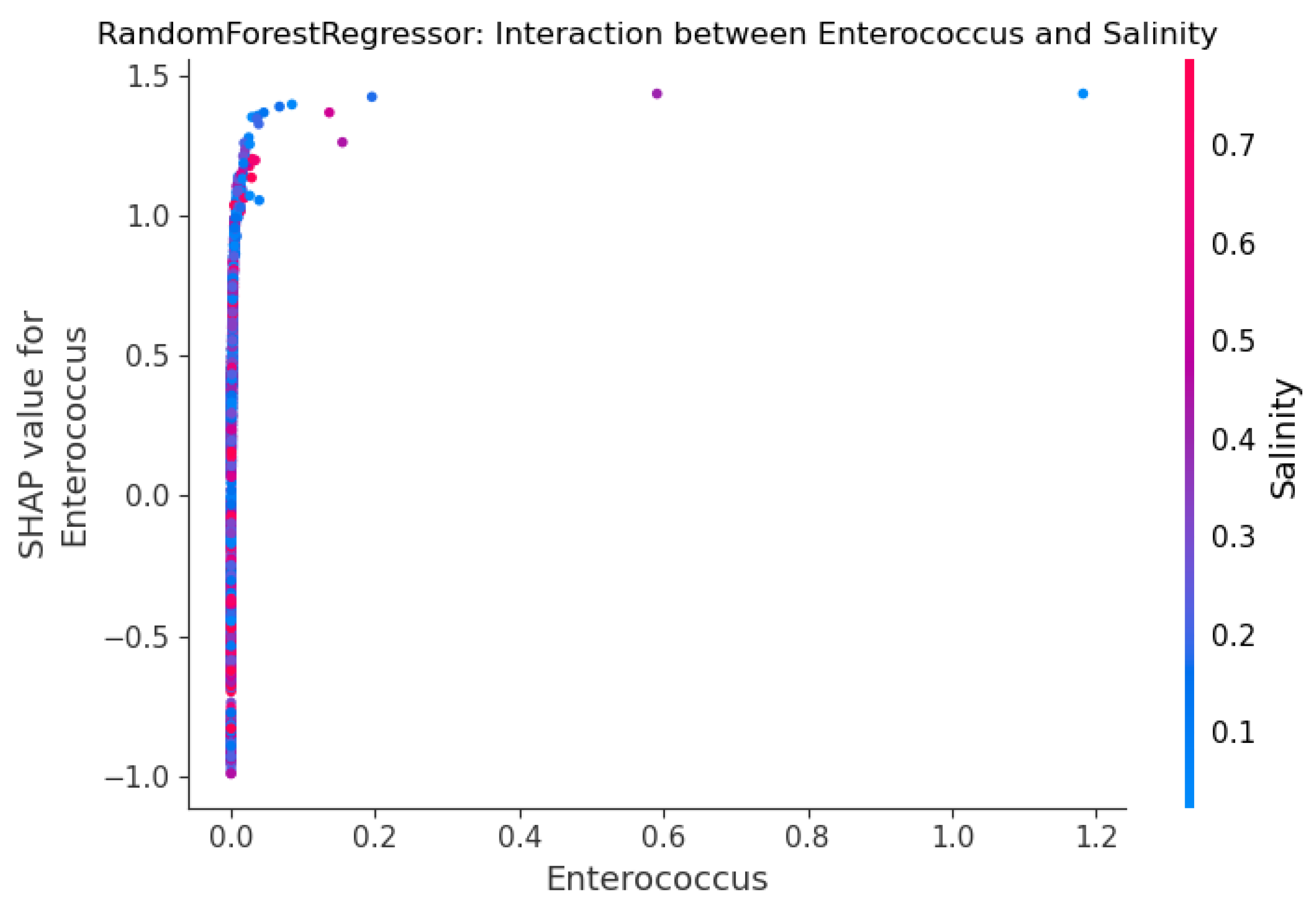 Figure 11 shows the SHAP interaction plot for enterococcus and salinity, the two most influential predictors identified in the RF model. This plot effectively reveals the relationship between enterococcus concentration and salinity in predicting fecal coliform levels. While high enterococcus concentrations consistently result in the highest positive SHAP values, indicating it’s the dominant predictor of high contamination regardless of salinity, the plot highlights a critical conditional risk factor at lower microbial levels. Specifically, when enterococcus concentrations are low, the model’s prediction is strongly influenced by salinity: the presence of low salinity (blue points) significantly amplifies the positive impact of even moderate enterococcus readings (pushing the SHAP value higher). Conversely, a high salinity (red points) reinforces the model’s prediction of a low coliform risk when enterococcus is low, driving the SHAP value to be more negative. This pattern supports the hypothesis that low salinity acts as a crucial contextual proxy for freshwater runoff and dilution, maximizing the predicted risk associated with microbial indicators following a contamination event.