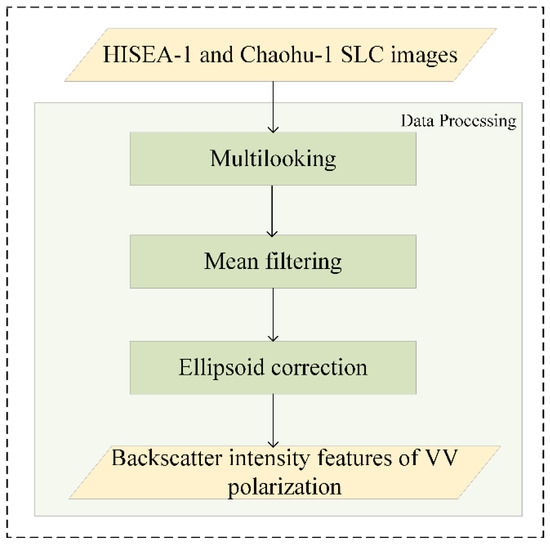 The pre-processing steps for obtaining backscatter intensity features from HISEA-1 and Chaohu-1 images are illustrated in Figure 2. The data pre-processing steps encompass multilooking, mean filtering, and ellipsoid correction. Furthermore, the number of range looks and azimuth looks are set to two and one during the multilooking process, respectively. The 3 × 3 window mean filtering is used to mitigate the speckle noise commonly found in SAR images and preserve local textures and edge details, reducing excessive smoothing effects on boundaries. Terrain correction is performed through ellipsoid correction geocoding, obviating the need for additional DEM data. It can ensure accurate geometric positioning and consistent pixel spacing while avoiding terrain-induced distortions in flat areas such as floodplains and lake basins.