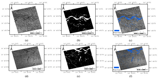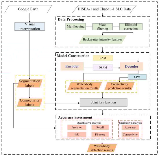 Surface water resources are a crucial foundation for maintaining the stability of the Earth’s ecosystem and the development of human civilization. An intact and interconnected water system network governs the redistribution of precipitation and runoff, influences regional groundwater recharge and evapotranspiration, and plays an essential role in carbon and sediment transport within the Earth system. Wetlands, rivers, lakes, and other water bodies not only support rich biodiversity but also maintain the dynamic balance of the environment through processes such as climate regulation, flood buffering, and biogeochemical cycling. Efficient and accurate detection of surface water bodies has become a key factor in water resource conservation and sustainable utilization [1]. Synthetic aperture radar (SAR), as an active microwave sensor, enables all-weather, all-time Earth observation. Furthermore, the significant differences in SAR echo signals’ responses to various land cover types provide a basis for water-body detection [2,3].