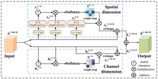 In the channel dimension, inter-channel relationships are reflected primarily by the relative importance of individual feature channels, and attention weights computed across channels are employed to selectively enhance or suppress information in specific channels. The input feature map is convolved and reshaped into , , and . After transposing to , the channel attention weight map is computed via matrix multiplication of and followed by the Softmax function. The product of and is then reshaped to , completing the channel-wise feature recalibration. For every spatial position in , the channel-wise feature value is computed as the weighted sum of all channel features at the corresponding position in the original feature map . is then scaled by a learnable factor and is added element-wise to to yield the final feature matrix . The process can be represented as follows: