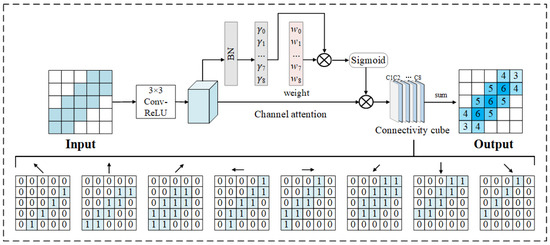 The CPM processes the input feature map through a 3 × 3 convolution to generate C channels, where C = 8 corresponds to eight neighborhood directions, as shown in Figure 8. Each channel encodes connectivity information for a specific directional adjacency. The predicted connectivity cube is subsequently recalibrated by a normalization-based channel-attention mechanism [23] so that connectivity information along the most important directions is strengthened. The input feature map is denoted as , where each slice represents the feature map in the -th direction. Channel attention employs the scaling factors from batch normalization (BN) to measure channel importance. BN is first applied to the input feature map, and the absolute values of its scaling factors are normalized to compute a weighting ratio for each channel. These weights are used to perform per-channel weighted multiplication on the input feature map, and the result is further normalized with a sigmoid function, yielding a vector whose elements lie in the range (0, 1), each indicating the importance of the corresponding channel. This weight vector is subsequently multiplied with the original feature map on a channel-by-channel basis, and the weighted multi-channel features are summed along the channel dimension. The process can be represented as follows: