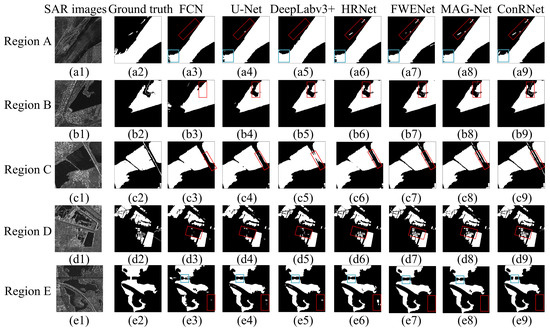The detection results of different methods. (a1–e1) SAR images. (a2–e2) Ground truth. (a3–e3) FCN. (a4–e4) U-Net. (a5–e5) DeepLabv3+. (a6–e6) HRNet. (a7–e7) FWENet. (a8–e8) MAG-Net. (a9–e9) ConRNet.