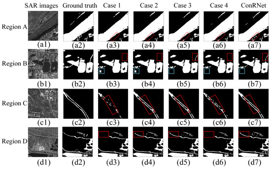 Figure 10 qualitatively presents the ablation results for four regions: the Yellow River channel (Region A), urban water bodies (Region B), water channels in suburban areas (Region C), and streams in agricultural fields (Region D). Case 1 shows significant missed detections for small water bodies and poor water-body connectivity in Figure 10(c3,d3). In Figure 10(b3,b4), due to the absence of the DSAM for integrating global information, both Case 1 and Case 2 suffer from significant false positives in construction areas with low backscatter coefficients, highlighted by the blue-boxed areas. Compared to Case 1, Case 3 provides more complete detection of water bodies in the red-boxed areas of Figure 10(b3,b5). Furthermore, Case 3 significantly improves the detection of water flow in the red-boxed area of Figure 10(d3,d5) by incorporating the LAM, as the LAM effectively integrates information across different scales, enhancing the completeness of small-stream and fragmented water-body detection. In Figure 10(c6,d6), due to the absence of the CPM, Case 4 experiences significant fragmentation, with discontinuous water-body boundaries leading to poor connectivity, thus negatively affecting the overall detection performance. In contrast, ConRNet accurately and completely identifies small water bodies in Regions A and B, benefiting from fine-tuning of local features, which captures water-body details and reduces information loss, and the role of CPM in optimizing water-body connectivity, effectively reducing boundary fragmentation. Overall, ConRNet performs best in all regions, effectively avoiding false positives and missed detections caused by complex backgrounds, demonstrating strong robustness and stability.