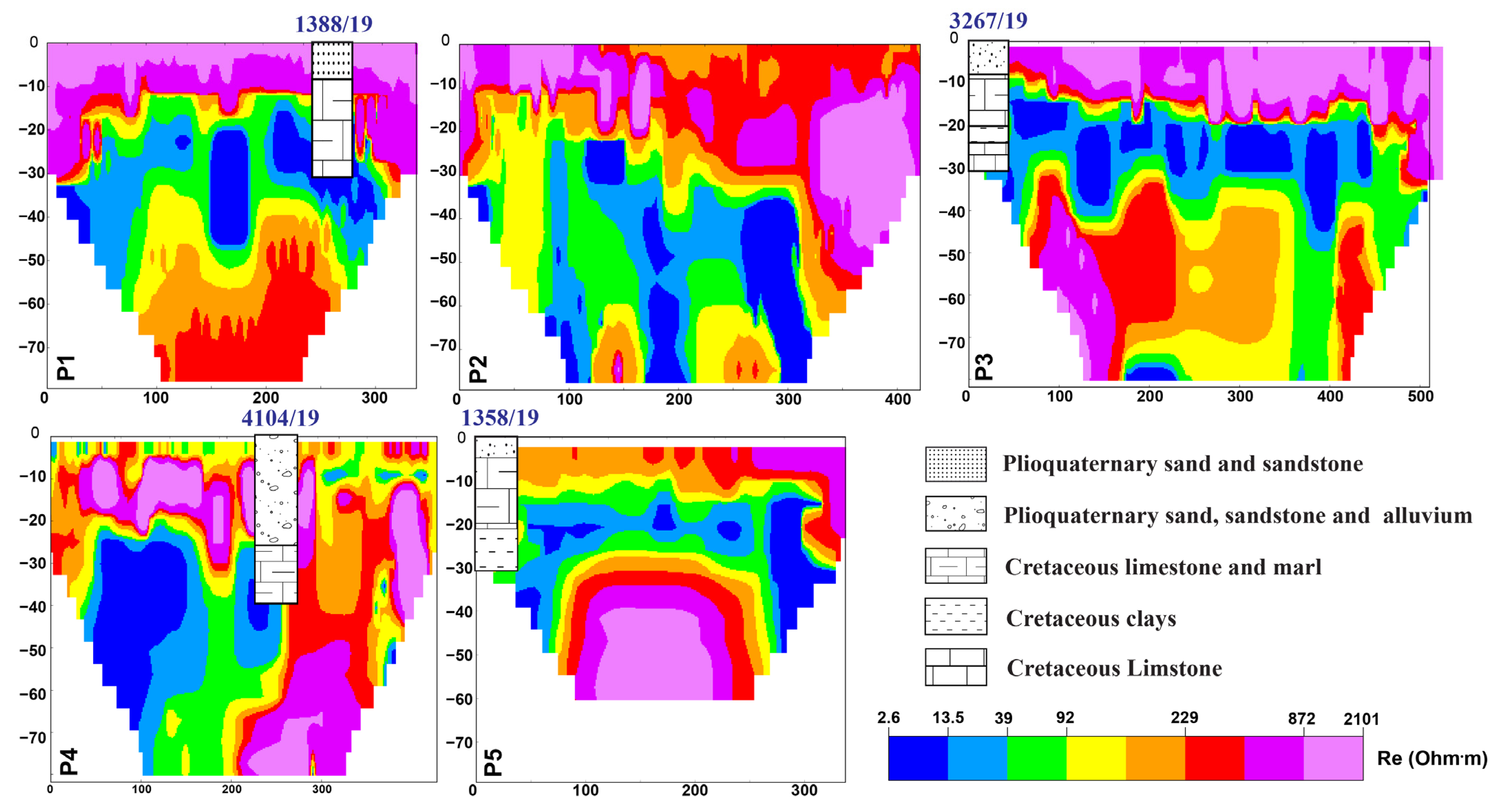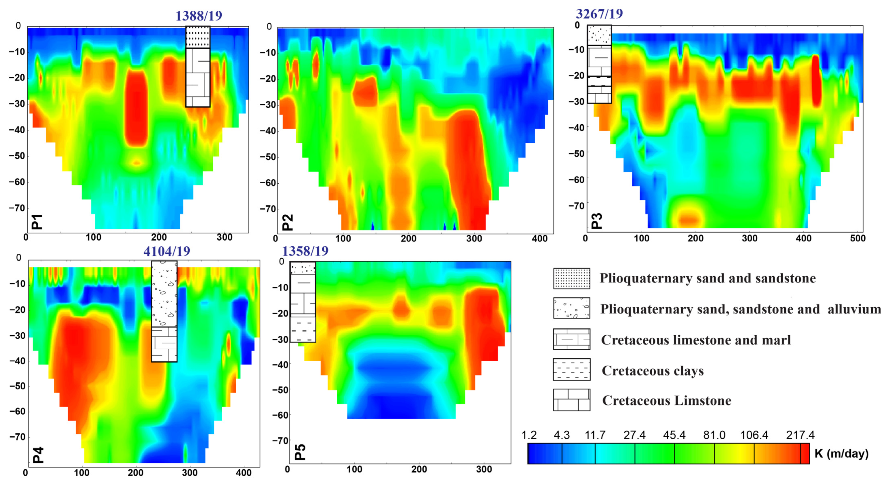 - Fadili, A.; Najib, S.; Boualla, O.; Makan, A.; Mehdi, K.; Kharis, A. Estimation of geohydraulic parameters in coastal aquifers based on VES transformed to ERT profiles. Environ. Earth Sci. 2023, 82, 404. [Google Scholar] [CrossRef]