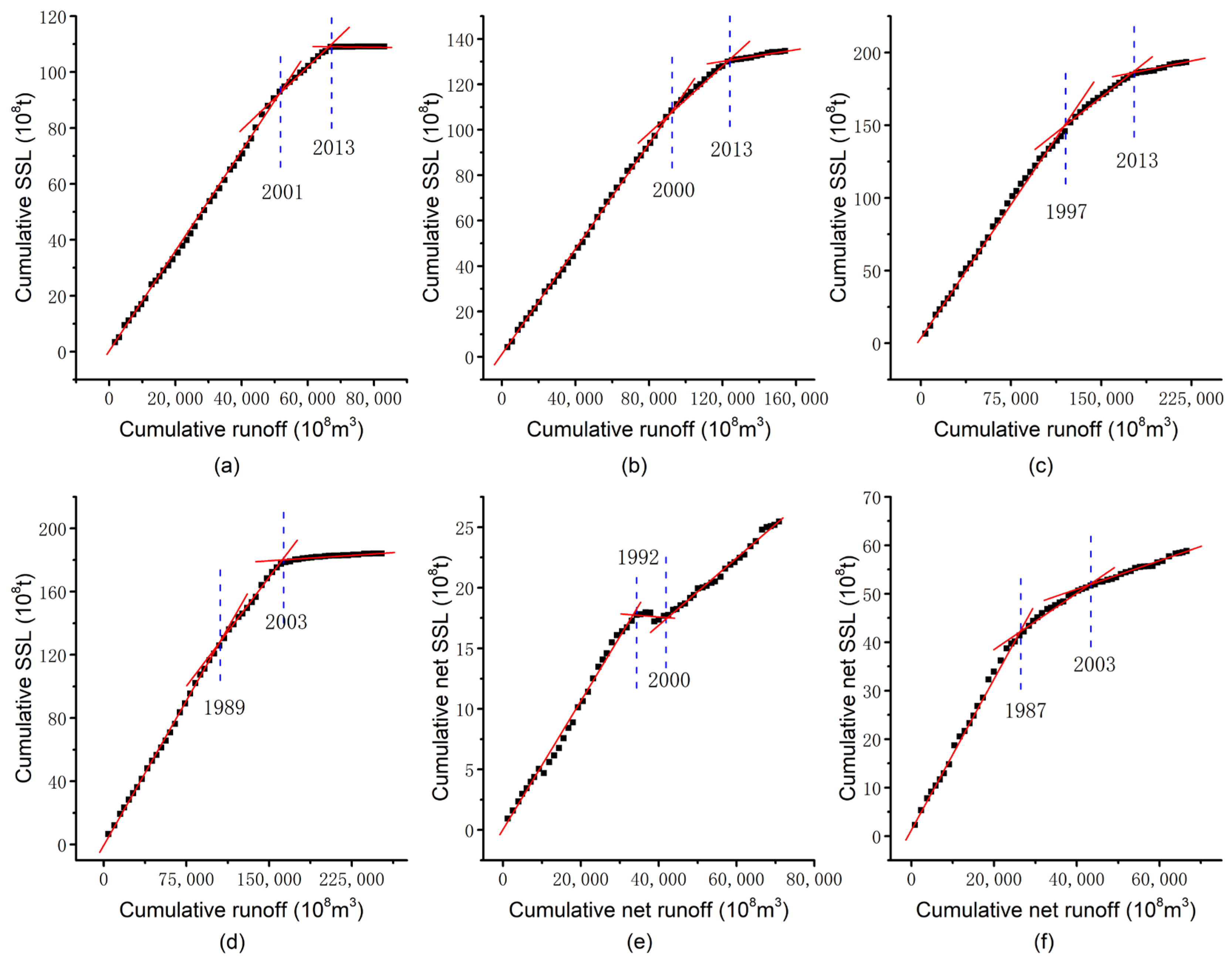 3.2.2. Inflection Years Based on Change in Double Series of Runoff and SSL