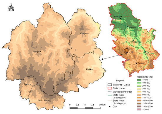 Golija forms part of the Dinaric mountain range (Figure 1) in southwestern Serbia and lies within the Starovlaško-Raška Plateau region [38]. The mountain encompasses an area of 538 km2 and is bordered by Mount Jelica to the north, Kopaonik, Čemerno, and Radočelo to the east, Javor to the west, and Zlatar, Jadovnik, and the Pešter Plateau to the south. The highest peak, Jankov Kamen (1833 m), dominates the main ridge, which also includes several notable summits: Crni Vrh (1795 m), Čardak (1688 m), Kulina (1642 m), and Jadovita (1560 m) [39]. Golija is situated approximately 232 km from Belgrade, with the following distances to major regional centers: Kraljevo—125 km, Novi Pazar—37 km, Ivanjica—44 km, Sjenica—33 km, and Raška—43 km.