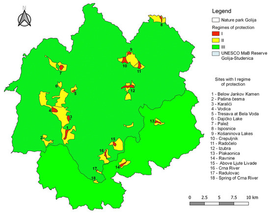 In 2001, a portion of the Golija Nature Park—covering approximately 72.5% of its total area—was designated as the Golija–Studenica Biosphere Reserve under the Act of the International Coordinating Council of the UNESCO MAB Programme [48,49,50]. Subsequently, in 2002, the Government of the Republic of Serbia established the Coordination Committee for the Protection and Development of the Golija Area, with the objective of guiding activities related to the formulation of programmes and planning frameworks for the socio-economic and environmentally sustainable development of the region. This initiative aligns with the UNESCO Biosphere Reserve criteria, aiming to preserve the area’s natural and cultural heritage, enhance the quality of life of local communities, and foster the development of compatible economic and environmental activities [47] (Figure 2).