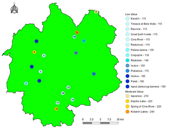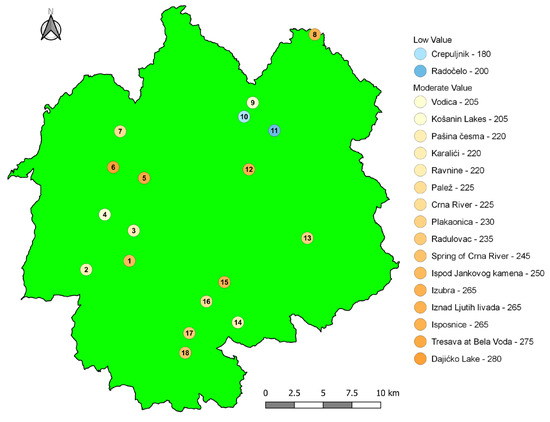 Palež and Crna Reka (225), as well as Ravnine (220), have moderate scores. A common characteristic of Ravnine and Crna Reka is their difficult accessibility. Despite their high ecological and hydrological importance, these sites are known only at the local level. Two additional sites with moderate PTU values are Karalići and Pašina Česma (220 points). Both are characterized by limited accessibility and a lack of promotion and valorization. Similar patterns have been observed in other protected mountain regions, where hydrologically valuable sites often receive moderate PTU scores due to difficult access and limited infrastructure [36,37]. The lowest scores among sites with moderate values were recorded for Vodica and Košanin’s Lakes (205 points). Košanin’s Lakes have significant hydrological and ecological importance, but access to the site is difficult, and there has been little promotion or development of its potential.