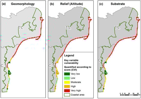 Geographically, the study area is divided into two distinct sectors (Figure 1), a division that is critical to the study’s findings. The northern sector, labeled “TL” for Tulcea County, is dominated by the extensive fluvial-deltaic system of the Danube Delta and characterized by low-lying terrain and significant terrigenous sediment input. The southern half, labeled “CT” for Constanța County, presents a stark geomorphological contrast, consisting of a heavily developed chain of tourist resorts and towns built on a foundation of active cliffs and small sandbars. This north–south dichotomy, visually represented by the administrative boundaries, is central to understanding the differing erosional processes and varying vulnerability scores observed in the results. The presence of bathymetric contour lines further contextualizes the study area by depicting the submersed coastal slope, which, along with the emerged relief, is a key physical parameter influencing vulnerability.