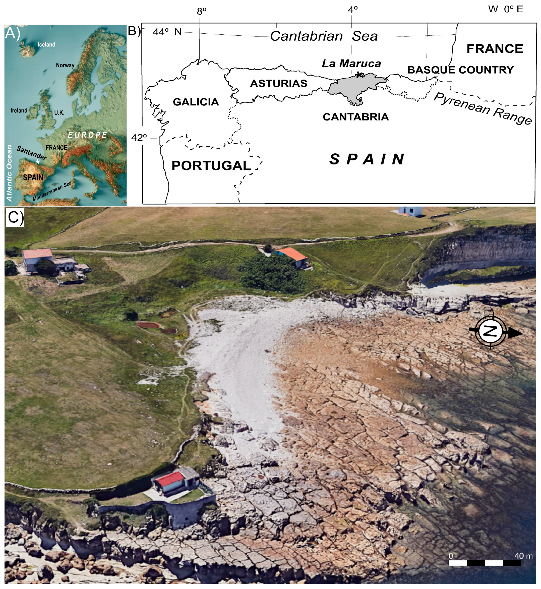 - Hoyos, S.; González, A.; Díaz de Terán, J.R. Geología y Geomorfología de La Península de La Magdalena. In Estudio del Medio Físico. Plan Director de la Península de la Magdalena; Sáinz Vidal, E., Ed.; Ayuntamiento de Santander: Santander, UK, 2008; pp. 43–53. [Google Scholar]
