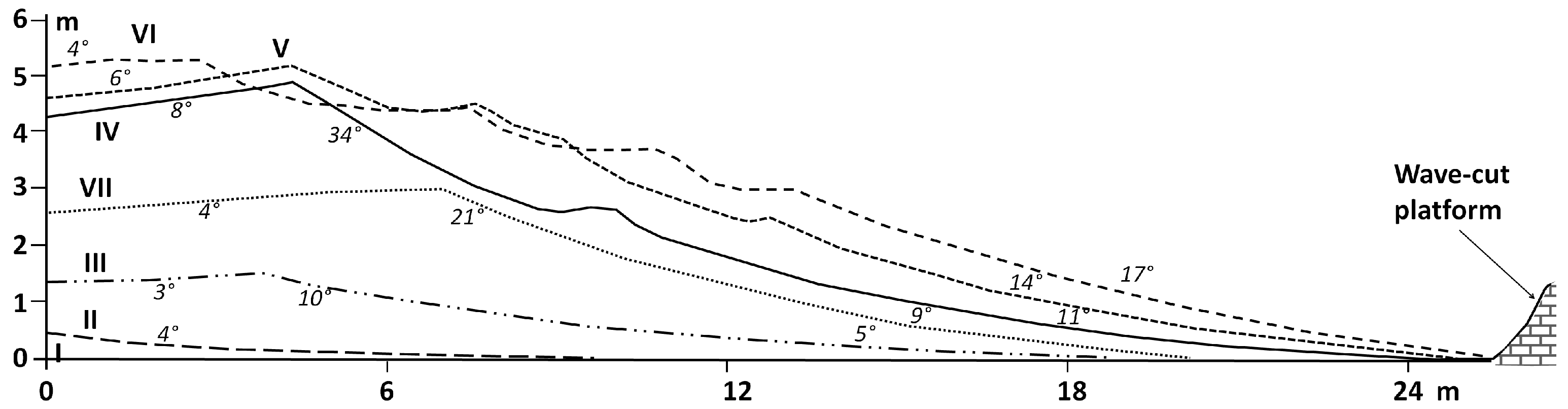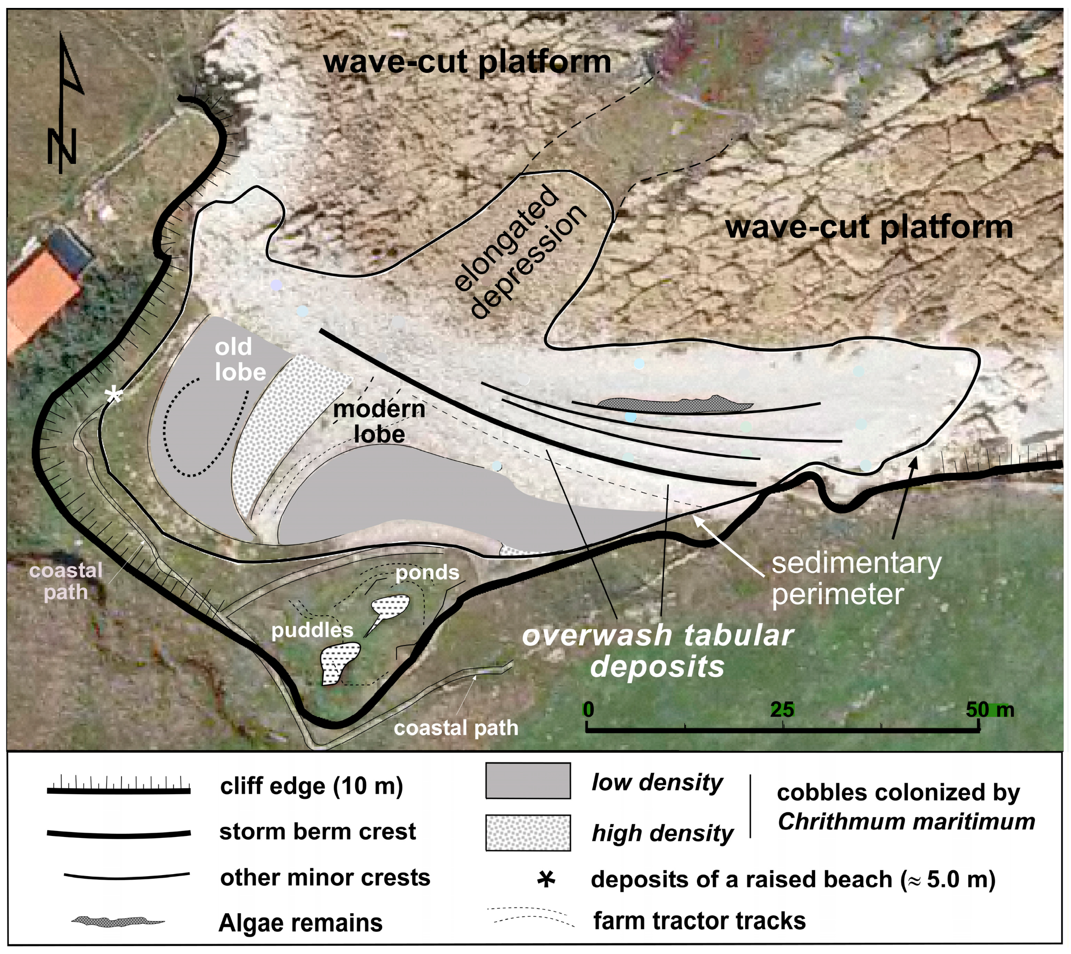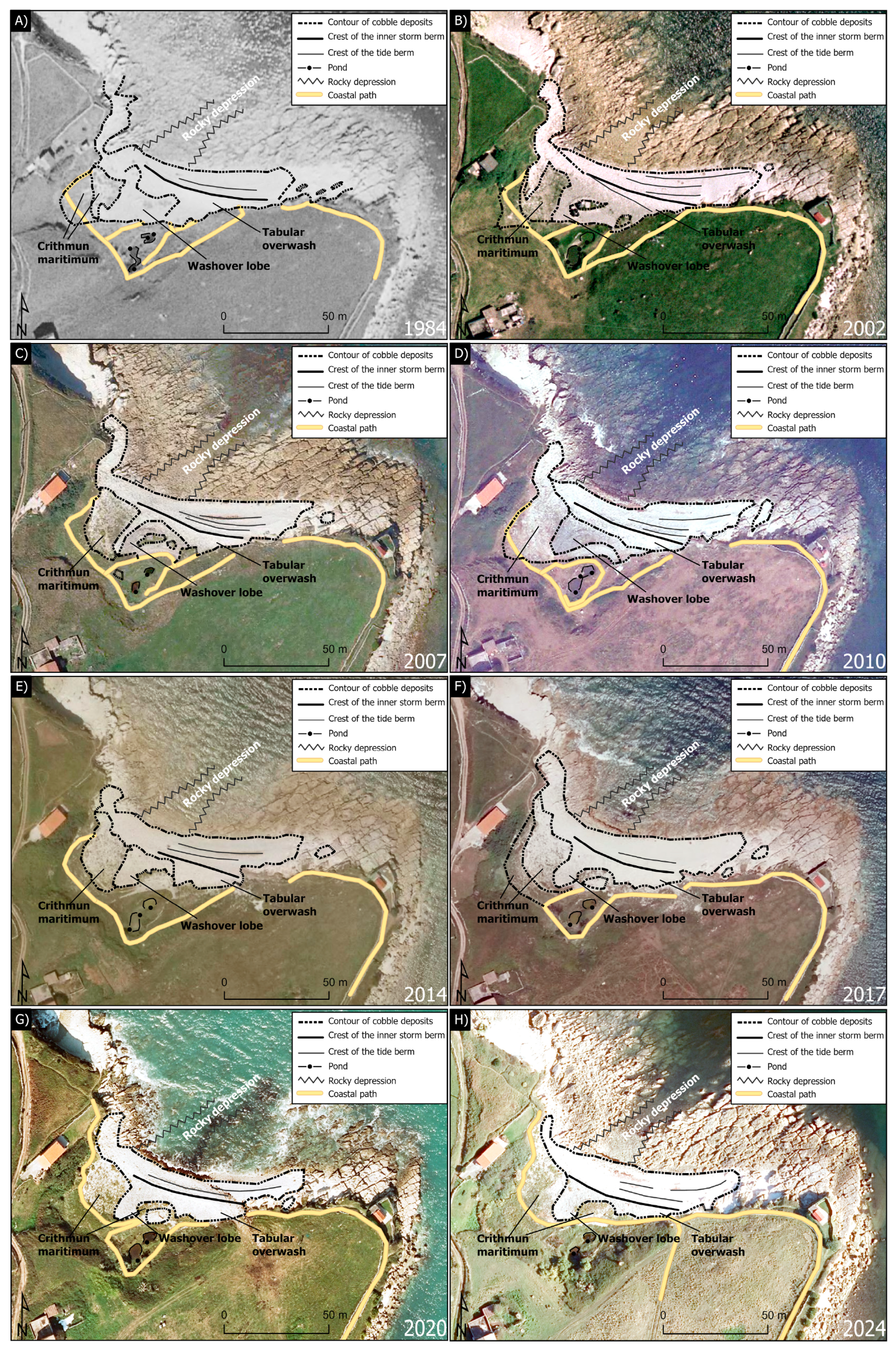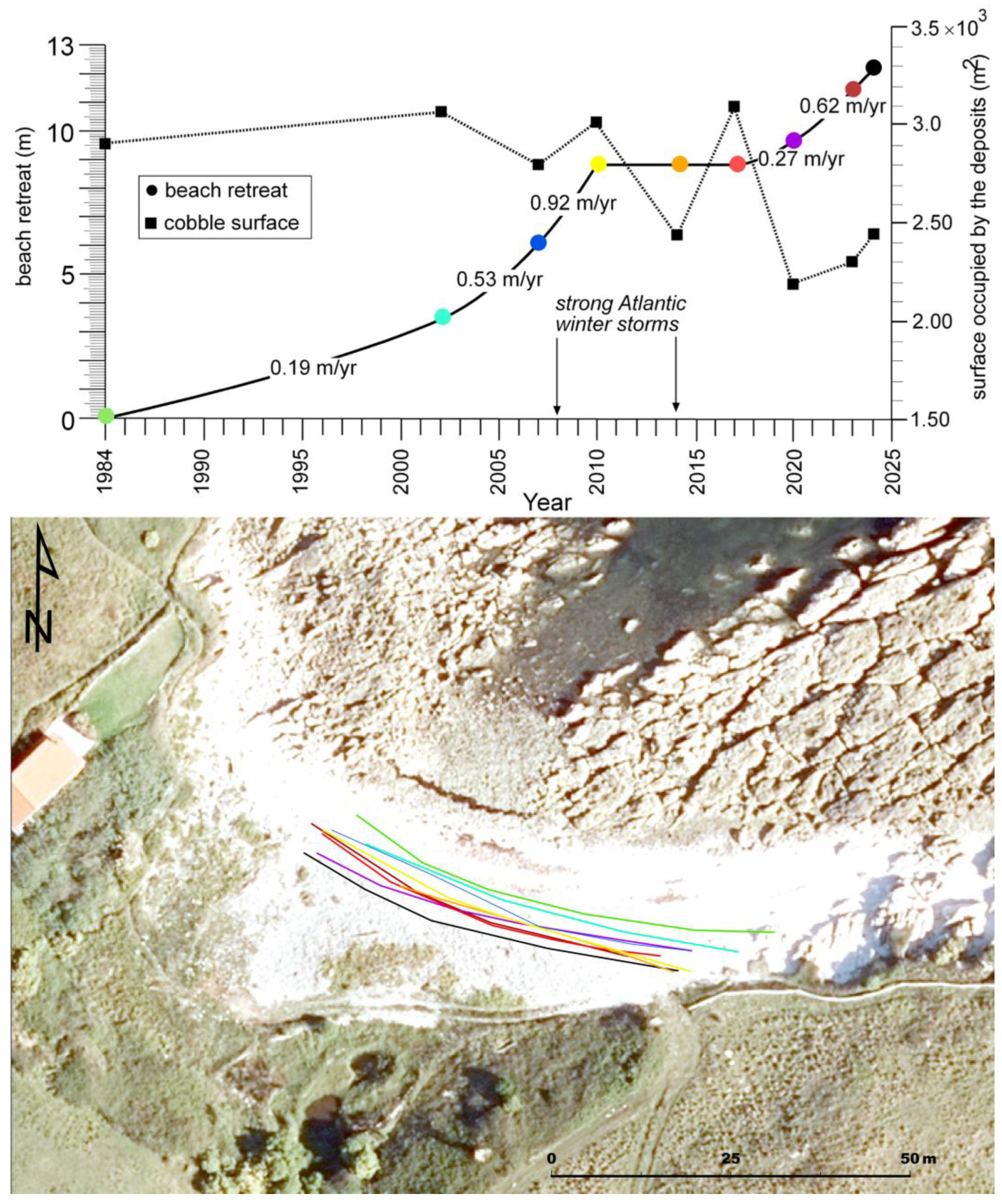 | Year | Surface Containing Deposits (m2) | Number of Crests (berms) | Crest Length (m) | Distance Between Crests (m) | Observations |