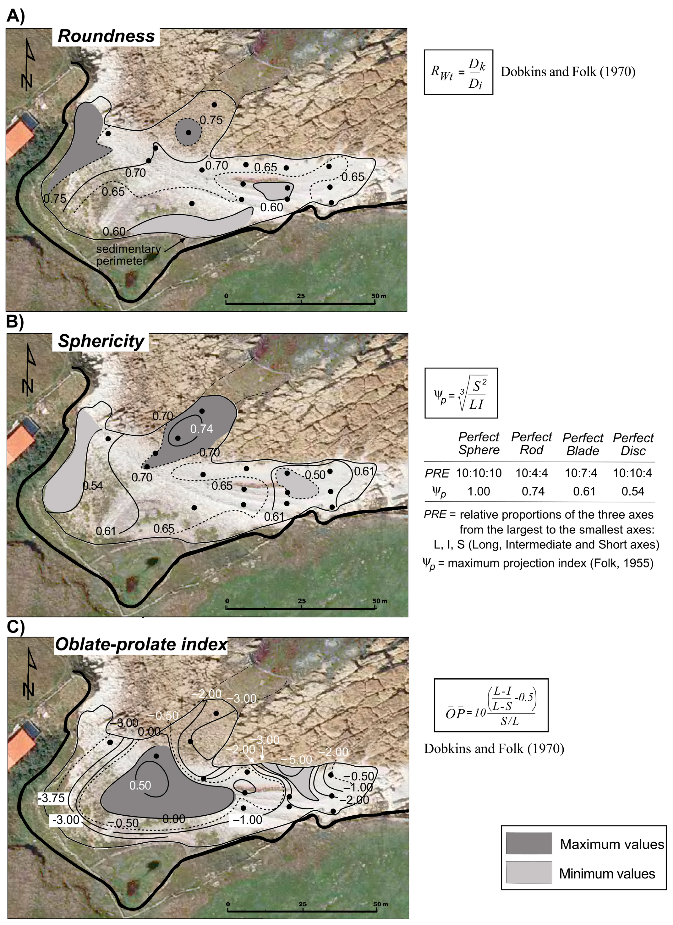 - Dobkins, J.E.; Folk, R.L. Shape Development on Tahiti-Nui. J. Sediment. Res. 1970, 40, 1167–1203. [Google Scholar] [CrossRef]