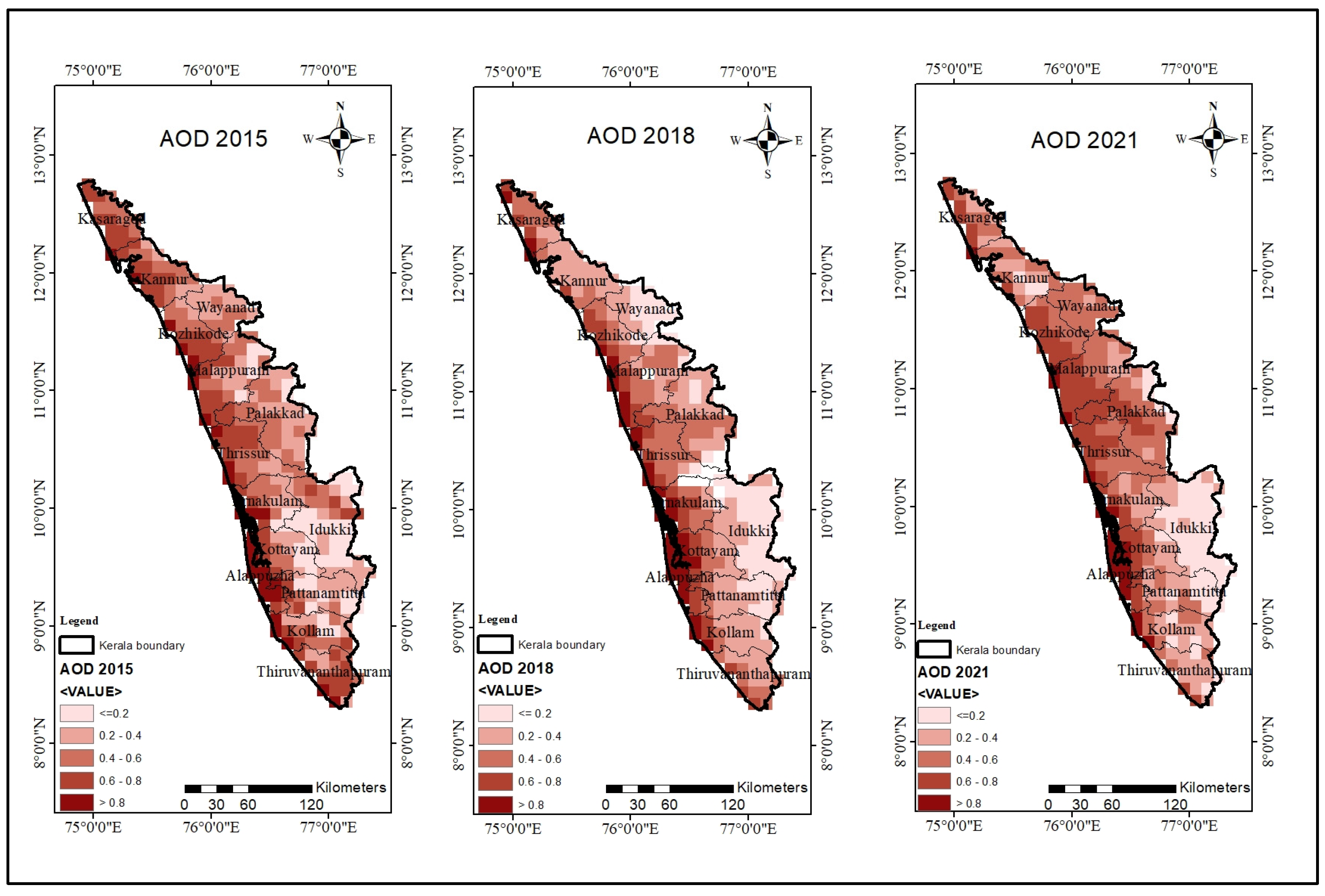 3.2. AOD (550 nm) Trend in Kerala