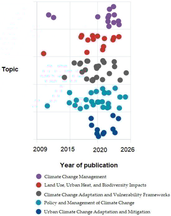 Thematic clusters discovered by LDA modeling shed light on some specific aspects of the topic that were not directly mentioned in the reviews. For example, the cluster “Urban Climate Change Adaptation and Mitigation” reflects the trend of research on urban environmental governance [32,40]. This idea of cities being the primary locations of climate activities is the main point here, as was indicated in the publications that dealt with the issue of how cities can implement innovative, small-scale climate solutions as a result of being laboratories [32,58]. The mutual existence of “Policy and Management of Climate Change” and “Climate Change Adaptation and Vulnerability Frameworks” themes gives an indication that authors such as Happaerts and Van den Broeck [86] were talking about the same thing when they mentioned both mitigation and adaptation strategies. Reading through the “Land Use, Urban Heat, and Biodiversity Impacts” gestalt, one can see that these kinds of environmental issues are closely linked, which is a recurring topic in both the “European Green Deal” and other similar policy documents [19,72]. Moreover, “Climate Change Management, Future Projections, and Assessment” stays in line with the idea of monitoring at the international level and the role played by organizations such as the IPCC and the European Environment Agency in this regard [10,93].