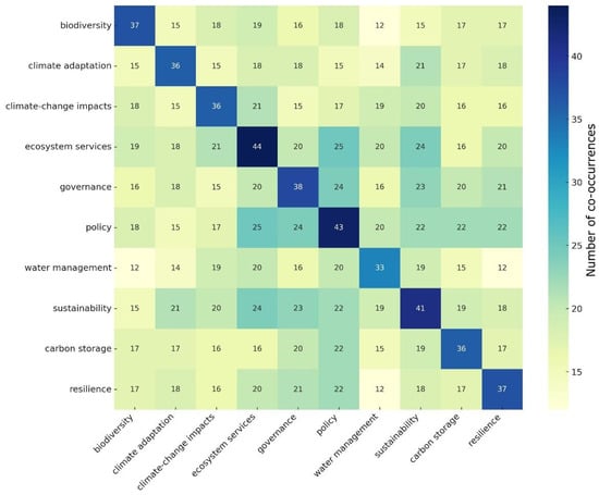 Figure 4 presents a heatmap to show the co-occurrence of environmental keywords across the 80 analyzed publications. The rows and columns of the heatmap represent the keywords identified (e.g., biodiversity, climate adaptation, policy, resilience). The blue color’s intensity reflects how often a pair of keywords are found together in the same publication. The strongest associations, i.e., the most frequent combinations, are represented by the darkest blue shades. The diagonal cells indicate the total occurrences of each keyword in the dataset. Each cell shows how many times the two keywords appeared together. This visualization signals adjacent thematic clusters, i.e., not only tightly interrelated concepts such as resilience and governance but also uncovered areas of (potential) research where relationships between the themes are weaker or even nonexistent. Hence, the heatmap offers a more explicit presentation of the dwell areas in both policy and academic debates of climate change, providing a superior grasp of how the issue of the interconnected nature of climate change is being solved in the literature.