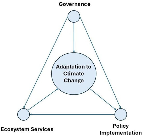 The climate change adaptation theme seemed to be the central point of both the network and density visualizations [49]. These strong links between “adaptation to climate change,” “ecosystem services,” “governance,” and “policy implementation” give a good indication of the polycentric and multi-level nature of the environmental governance model that is currently very popular among researchers in the field [38,87]. Successful adaptation, as is found in the research here, is not a single event but a complex combination of realizing climate effects [74,75,76,77], applying ecosystem services for resilience, building strong governance systems, and pushing forward effective policies. This is in line with the claims of multi-sectoral and multi-level collaboration, which is the main theme throughout the broad literature [86,87].