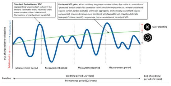 A conceptual diagram of ‘new’ carbon entering the soil system over a 25-year crediting period. Transient fluxes of SOC (blue) versus the accumulation of more persistent SOC. Graphic from [71].