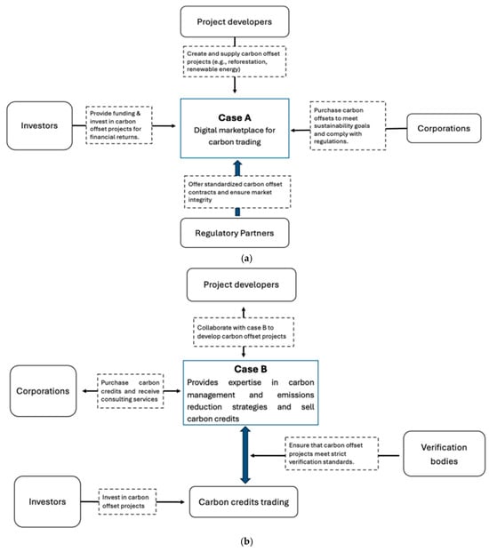 (a) Case A operation narrative showing a digital marketplace for carbon trading. Graphic from [43]. (b) Case B operation narrative which provides expertise in carbon management strategies, emissions reduction strategies, and sales of carbon credits. Graphic from [43].