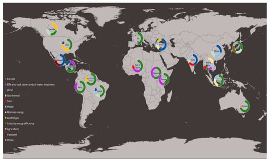Global distribution of carbon voluntary offset project types showing that there may be gaps in the types of benefits accruing in places that need them. Graphic from [70].