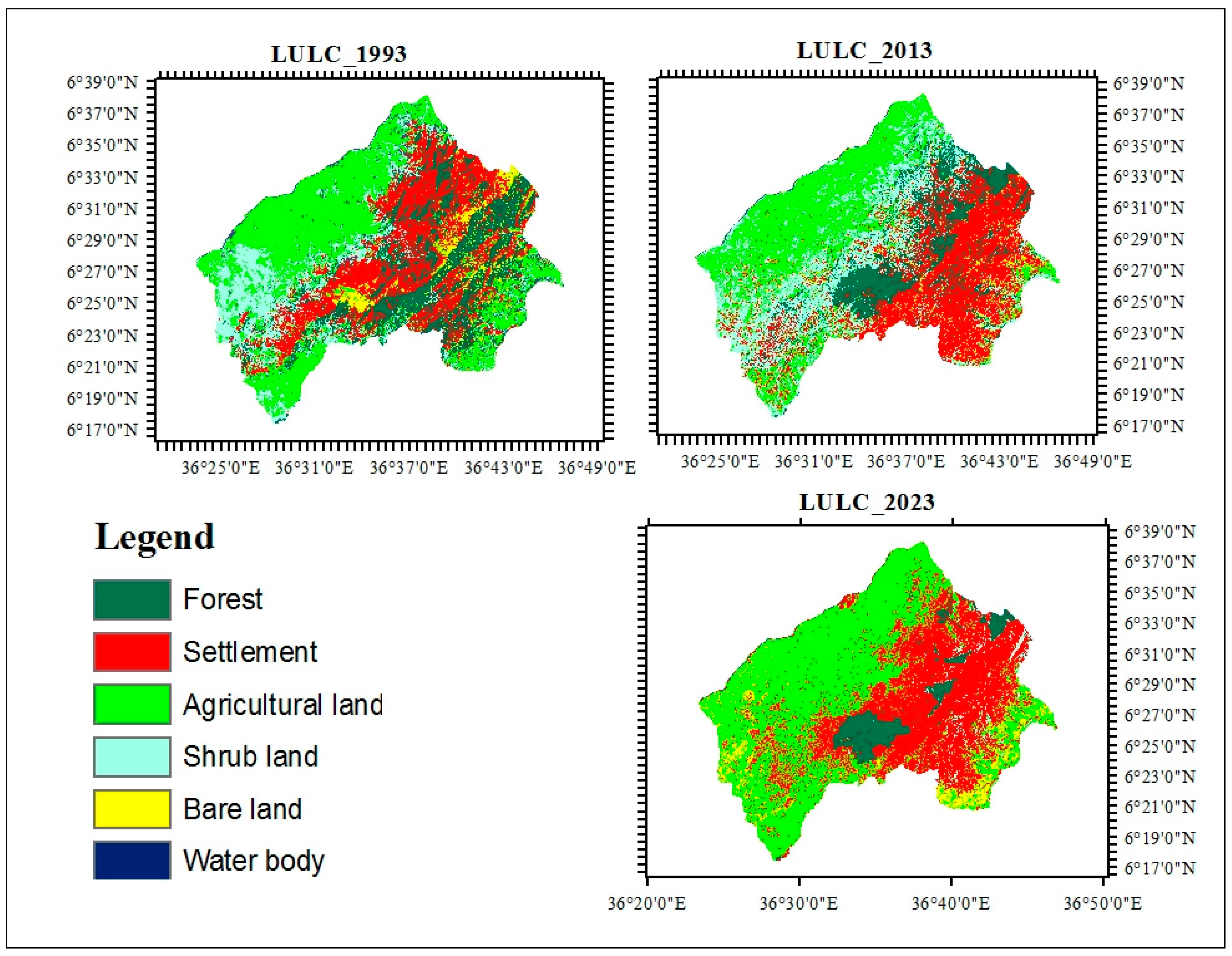 Table 5 provide a summary of the LULCC trend from 1993 to 2023 based on six classes and given a comparable amount of covered area. The classification of land cover according to the six land use and land cover types identified throughout the three occasions shows the conversion of the different land use classes. The main land uses that gradually increased throughout the study session were agriculture and settlements. For example, agricultural land increased by 88.50% from 1993 to 2013, 174.41% from 2013 to 2023, and 154.36% from 1993 to 2023. Bare land increased at a significant rate due to the Koysha hydroelectric power dam and highway constructions that might fragment the forest and thus make bare land. Forest-covered lands were mainly converted into agriculture and settlement. The largest change in forest cover to other land use types recorded between 1993 and 2013 was forest to agriculture, followed by forest to settlement. Similarly, between 2013 and 2023, more forest-covered lands were converted to agriculture, followed by settlements. In the area, conversions of shrubland, forest, bare land, water bodies, and agricultural land to settlement were mainly related to the increment of urbanization and human population growth.