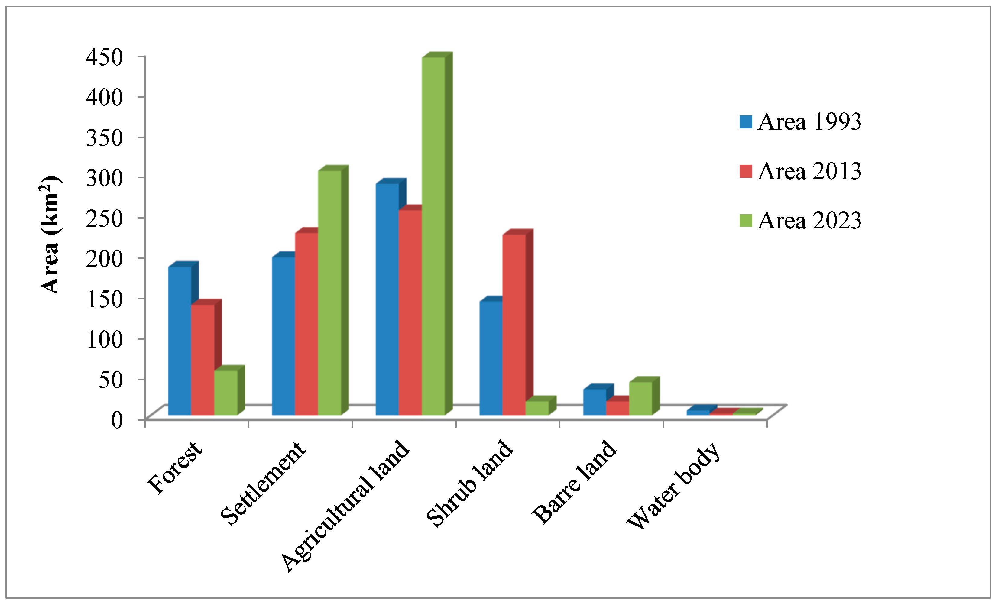 In 2023, the study area’s central region was covered by forest patches, with a few patches on the northern side. Mainly, agriculture was clustered in the west, and settlements were widely dispersed throughout the study area from the east to the middle, with a smaller number throughout the southern and other parts (