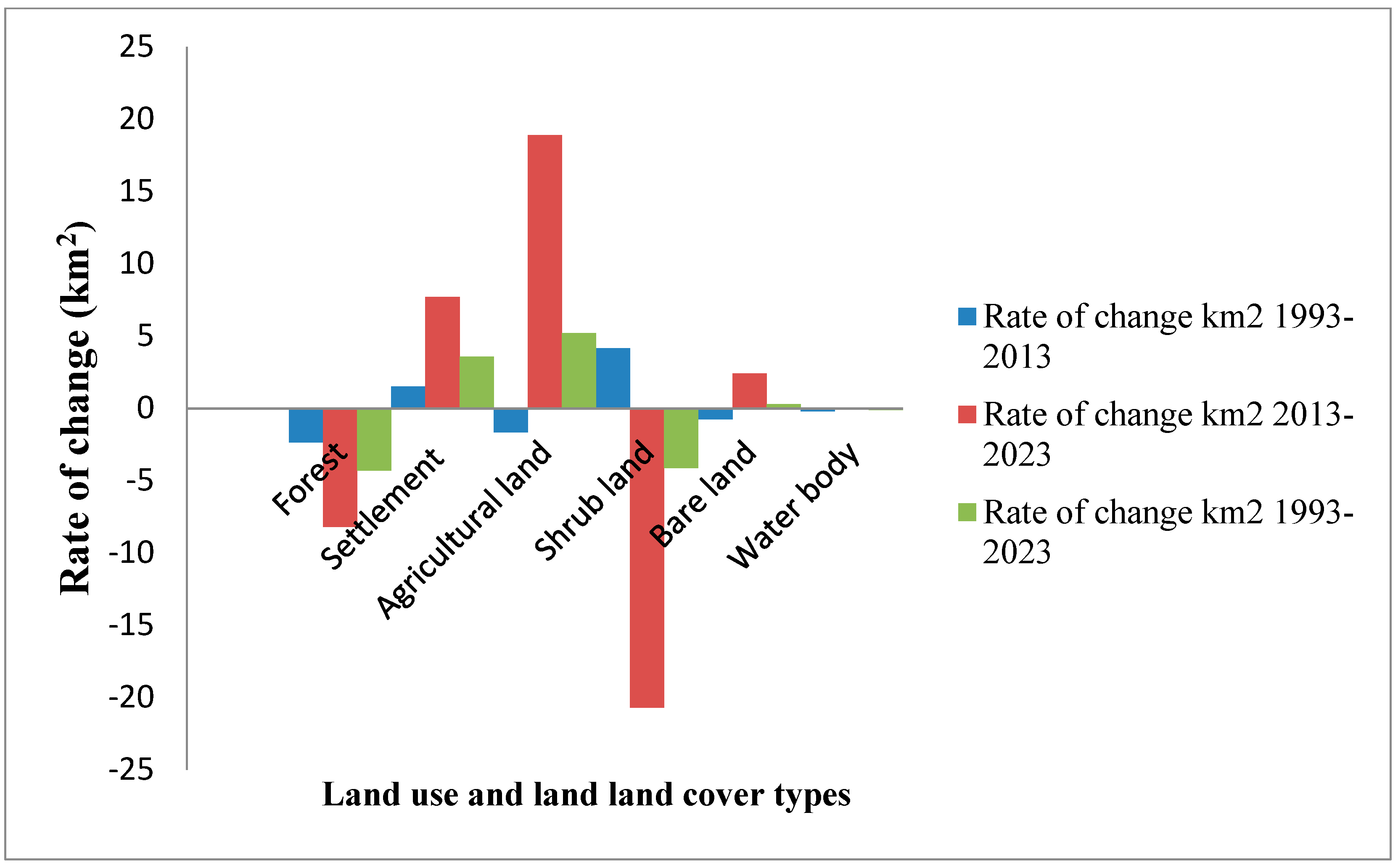 125] have reported that growing population and urbanization are causing a swift conversion of forested areas into agricultural land and settlements in Ethiopia. The findings of the current study imply declining rates of forest and shrub lands and increasing rates of agricultural land and settlement. The abovementioned studies broadly demonstrated to what extent agriculture and settlement expanded into forest cover throughout the study periods. Thus, the depletion of natural resources has led to a degradation of the ecosystem of the entire landscape. Population growth is among the major reasons contributing to LULCC in Ethiopia [