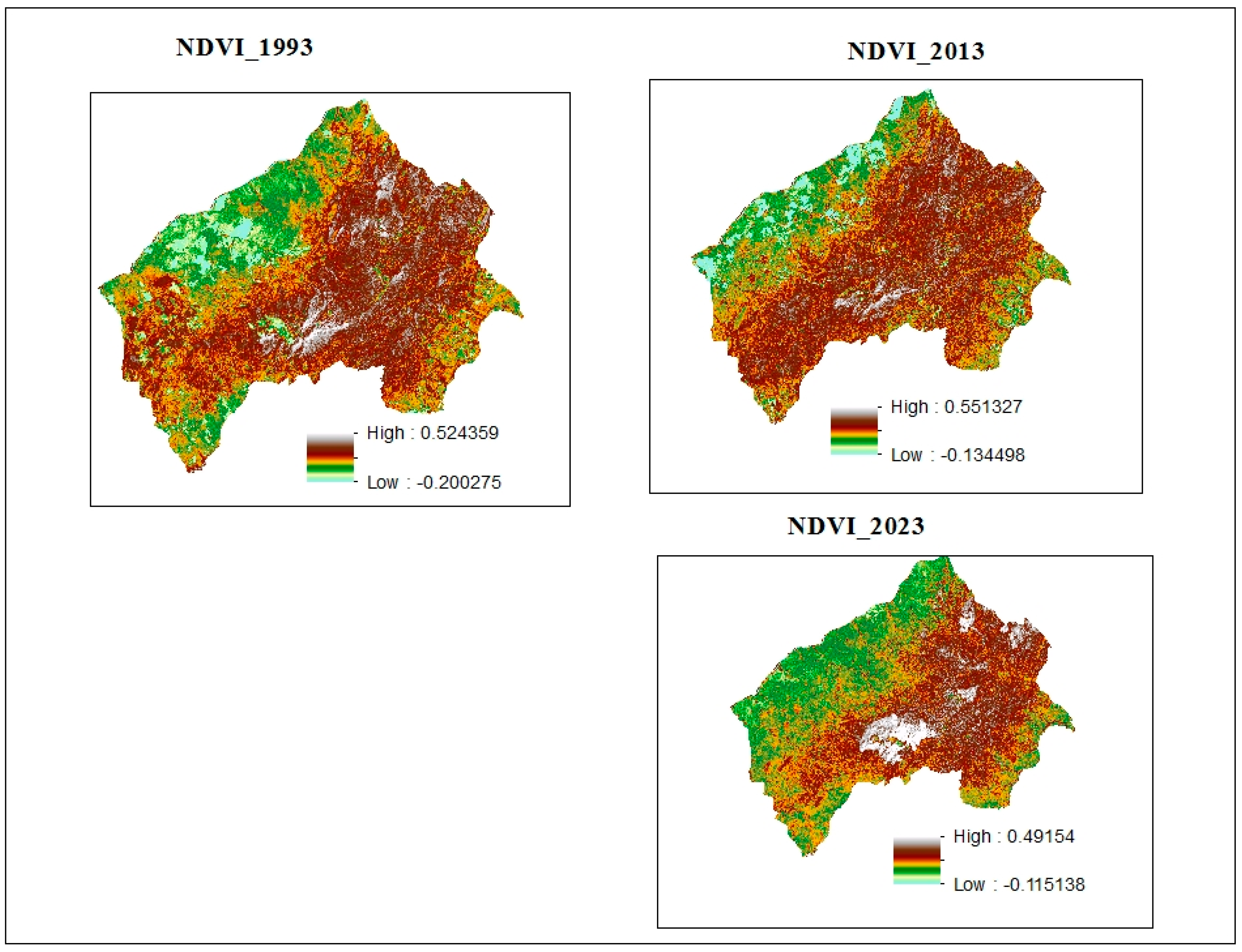 Between 1993 and 2013, the mean NDVI score showed that the healthiness of the forests was enhanced, but this then decreased in 2023. An increase in NDVI values determines the increase in the health of vegetation covers, whereas a decrease in NDVI values determines the decline in the vegetation health cover of an area. NDVI values imply the decline scenario of the vegetation cover in the study area. Similar findings have been reported by studies conducted elsewhere [