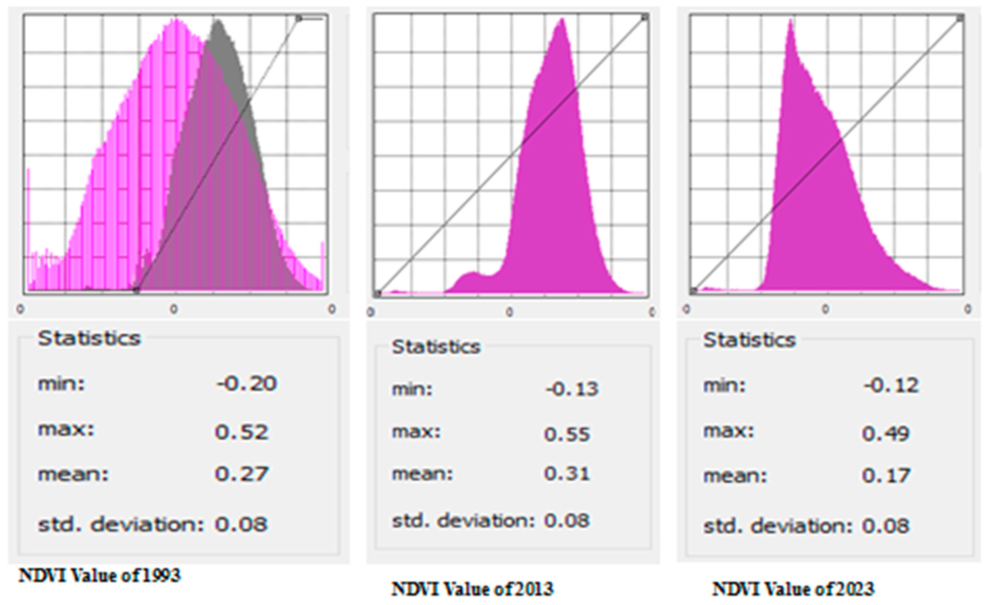 Figure 6 displays the comparison between the NDVI statistics for the years 1993–2023. The NDVI values for 1993, 2013, and 2023 were −0.20, 0.52, 0.27, and 0.08; −0.13, 0.55, 0.31, and 0.08; and −0.12, 0.49, 0.17, and 0.08, respectively, for the min, max, mean, and standard deviation. The year 2013 showed an escalation in the max and mean values (0.55 and 0.31), whereas the year 2023 showed a decrease in the max and mean values (0.49 and 0.17). The statistical data differences between study sessions revealed an increase from 1993 to 2013 and a decline in 2023 of the max and mean values, respectively. Also, this implies the decline of vegetation healthy coverage.