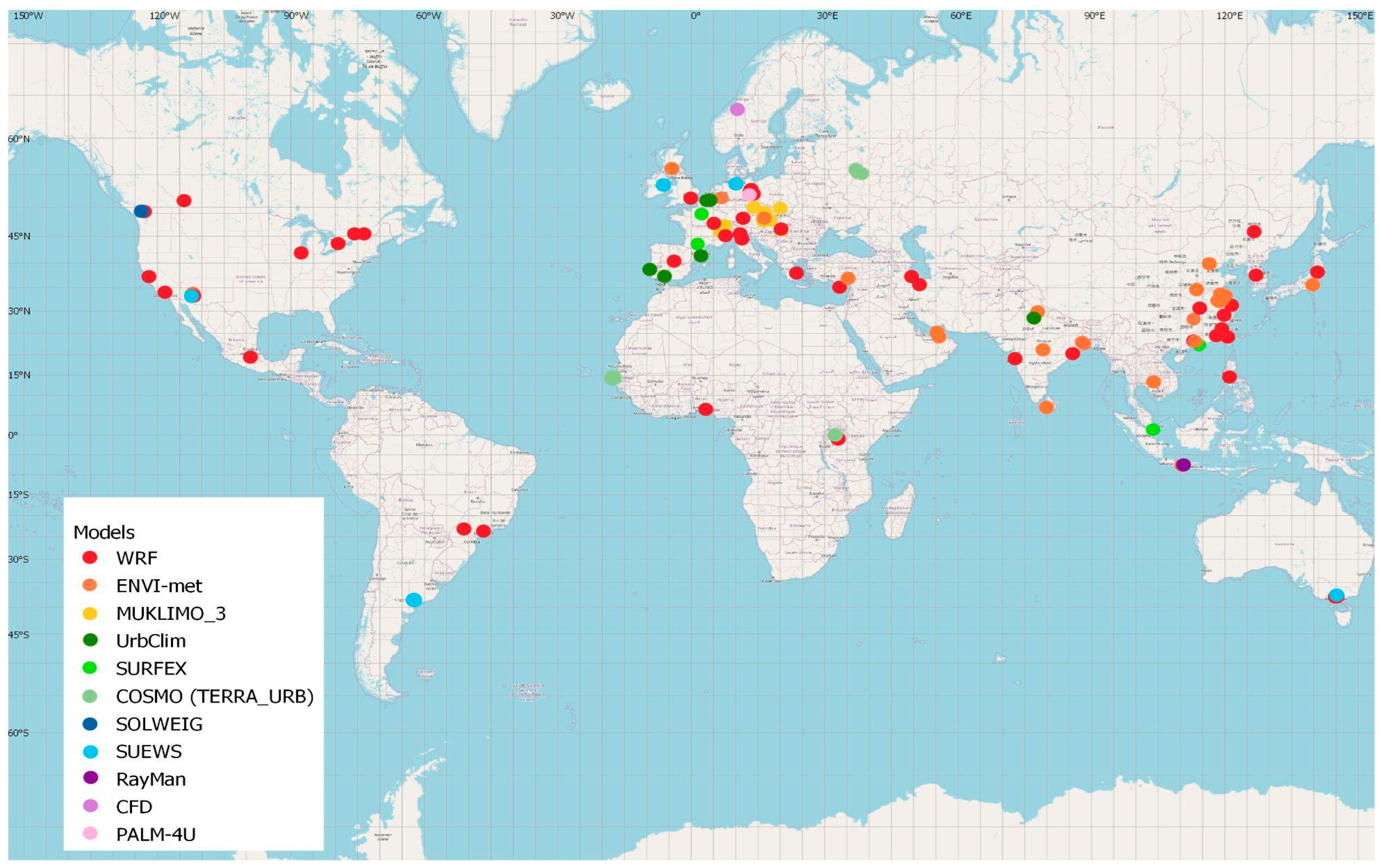 The geographical distribution of LCZ-based urban climate studies reveals strong regional patterns in model selection and research emphasis. WRF dominates globally, with dense clusters across East Asia (China, Japan, South Korea), South Asia, and major urban centers in Europe and North America, reflecting its role as the primary mesoscale framework for LCZ integration. ENVI-met studies are concentrated in Europe, the Middle East, South Asia, and parts of China, consistent with its use in micro-scale urban design and thermal comfort assessments. MUKLIMO_3 exhibits a distinctly Central European focus, including Austria, Hungary, Slovakia, and the Czech Republic, aligning with its development and operational use within the DWD community. UrbClim applications cluster in Western Europe (Belgium, Portugal, Spain) and parts of South Asia, reflecting its computational efficiency for UHI assessment. SURFEX and COSMO (TERRA_URB) appear primarily in Western and Central Europe, as well as selected African and Asian cities, indicating their regional adaptation within European research institutions. Supporting models such as SUEWS, SOLWEIG, RayMan, CFD, and PALM-4U appear more sparsely, often linked to targeted microclimate or model-coupling studies in Europe and selected global case locations. Overall, the global evidence map (Figure 1) depicts the location of the selected peer-reviewed studies using distinct symbols to represent the specific urban climate model employed.