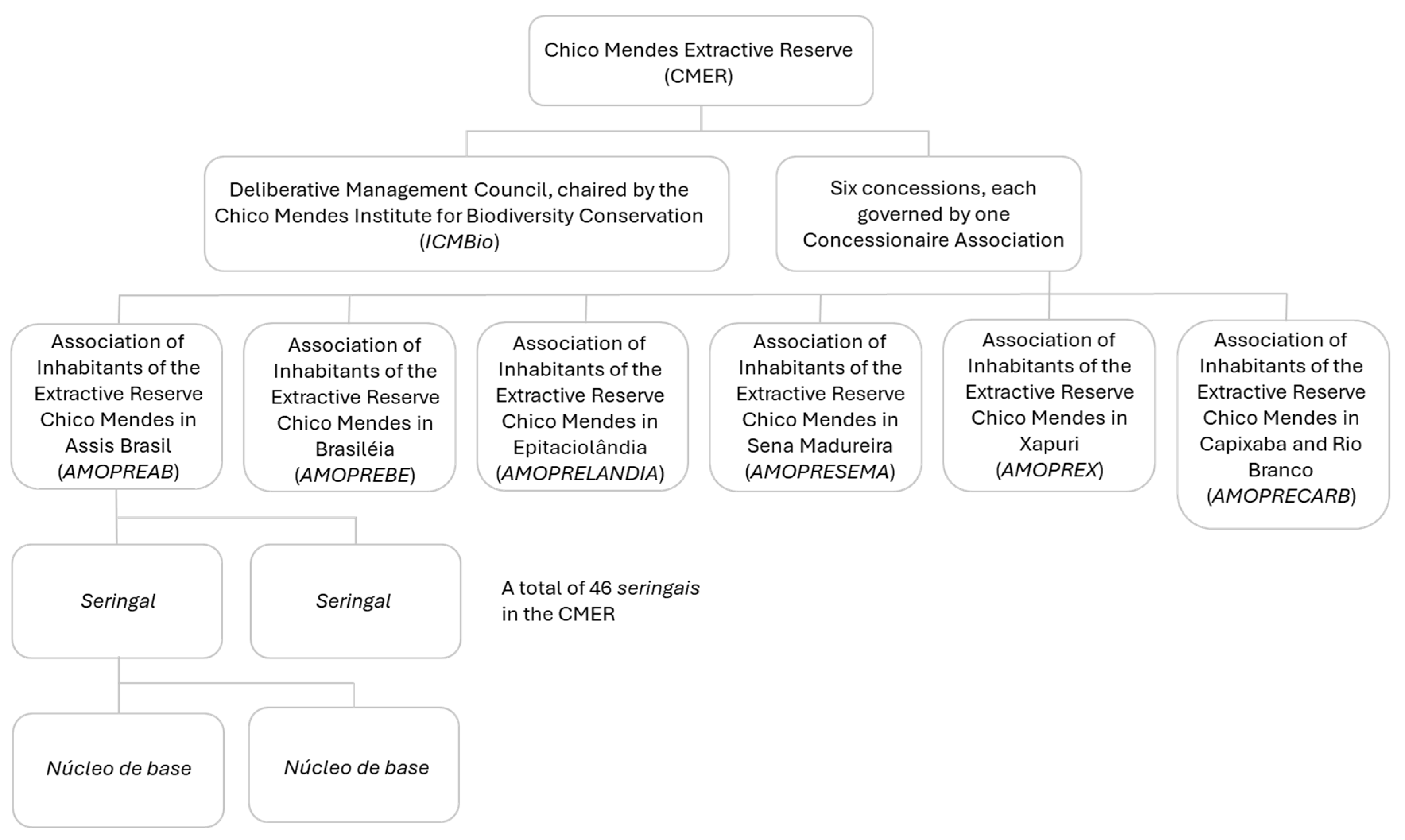 - WWF. Guia Informativo da Gestão Participativa na Reserva Extrativista Chico Mendes. Acre: WWF, 2015. 44p. Available online: https://wwfbrnew.awsassets.panda.org/downloads/guia_resex_chicomendes.pdf (accessed on 10 September 2025).