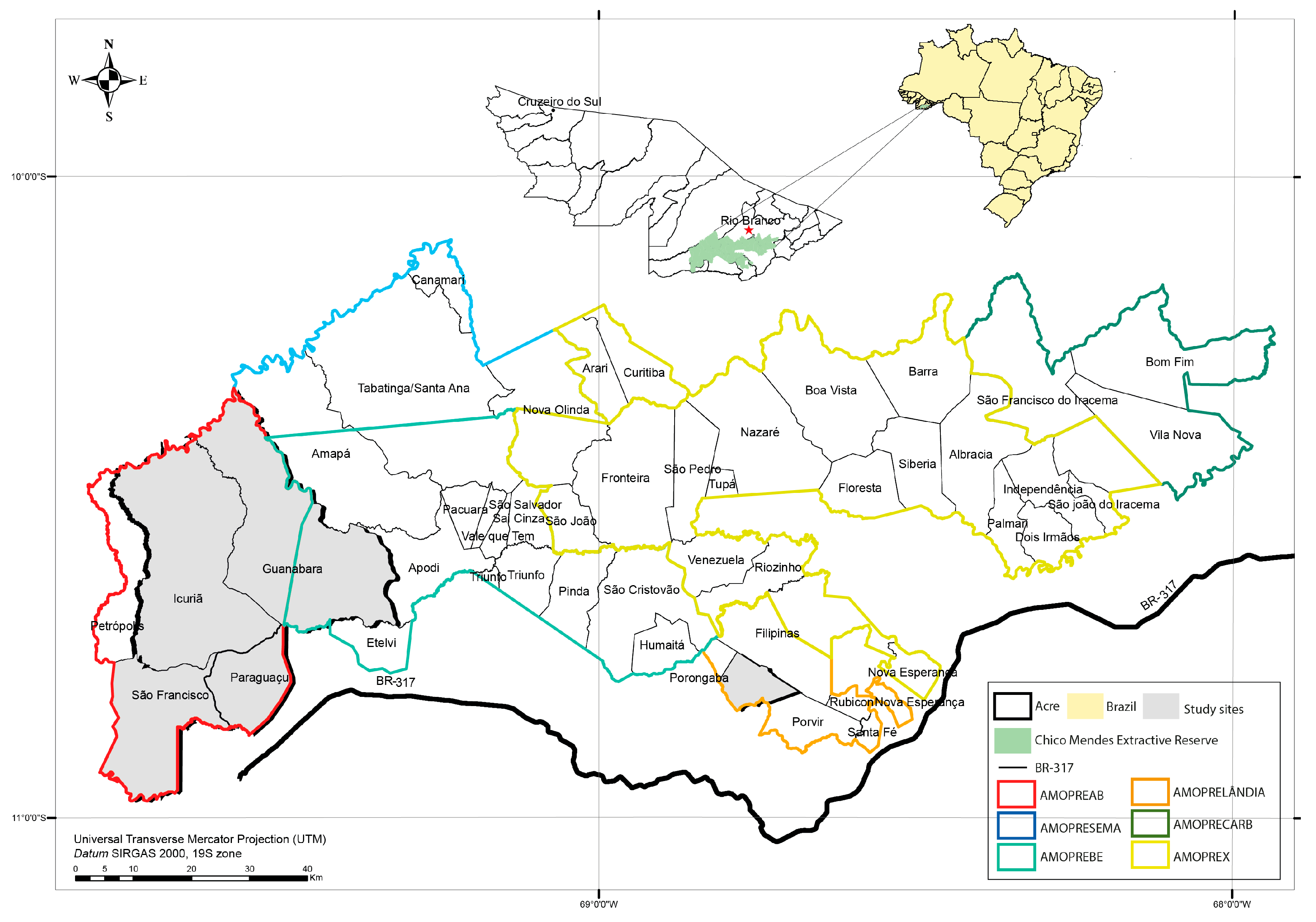 - Wallace, R.H.; Gomes, C.V.A.; Cooper, N.A. The Chico Mendes Extractive Reserve: Trajectories of agro-extractive development in Amazonia. Desenvolv. Meio Ambiente 2018, 48, 184–213. [Google Scholar] [CrossRef]