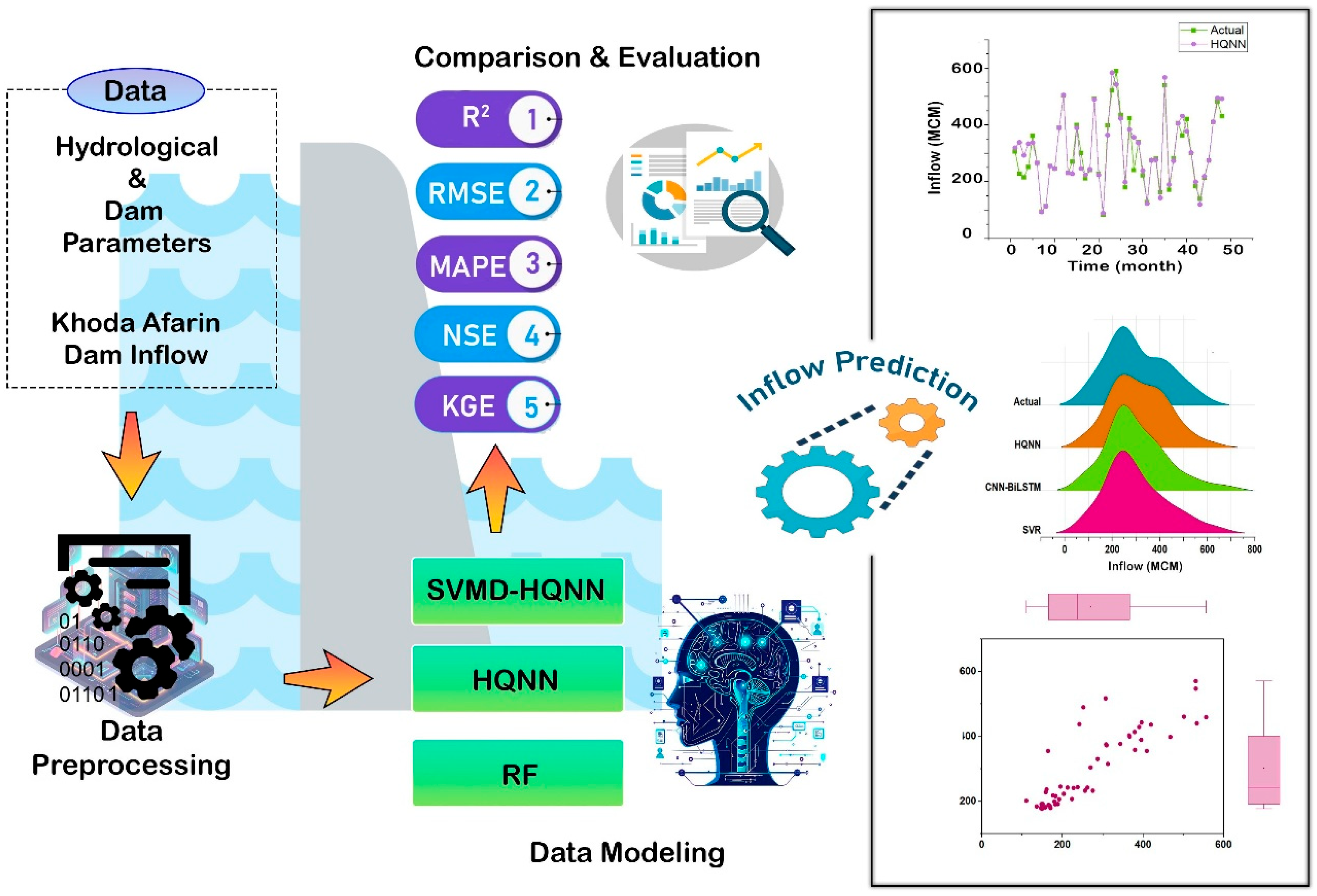 Therefore, SVMD-HQNN, as an advanced forecasting model, has the potential to be applied in fields such as flood management, water allocation, and dam performance optimization, and can improve the accuracy and efficiency of dam inflow forecasting compared to classical models.