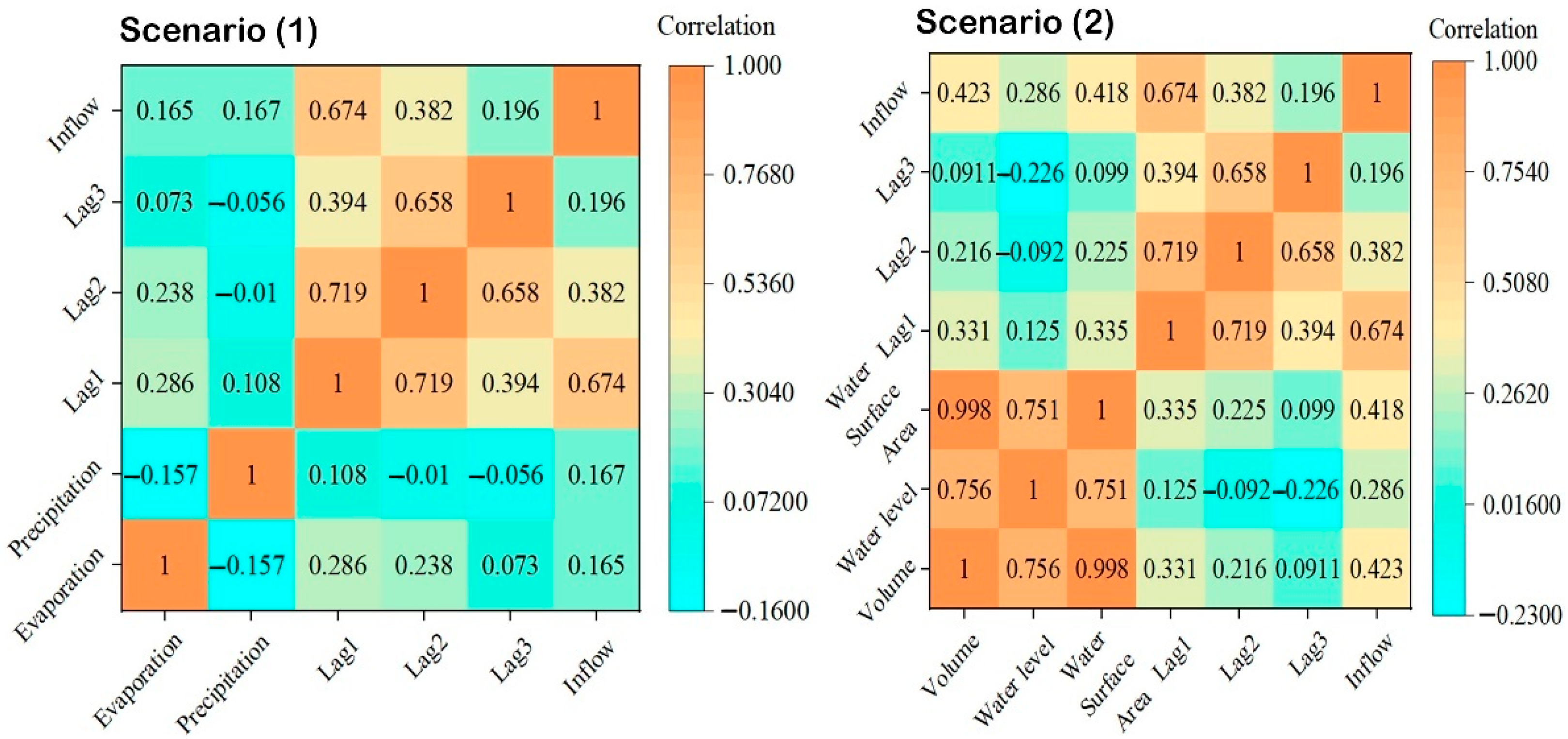 In Scenario 1, the meteorological parameters (precipitation and evaporation) show weak to moderate correlation with inflow (0.167 and 0.165), suggesting limited direct influence, possibly due to lag effects in the hydrological response. Scenario 2 substitutes meteorological parameters with reservoir operational variables. Here, inflow’s correlations with Volume (0.423), Water Surface Area (0.418), and Water Level (0.286) are moderate and comparable to those of Lag2 and Lag3, indicating these state variables also capture relevant system behavior for inflow prediction. The three lagged inflow variables (Lag1, Lag2, Lag3) play a crucial role in dam inflow prediction by capturing the temporal dependencies and persistence present in hydrological time series data.