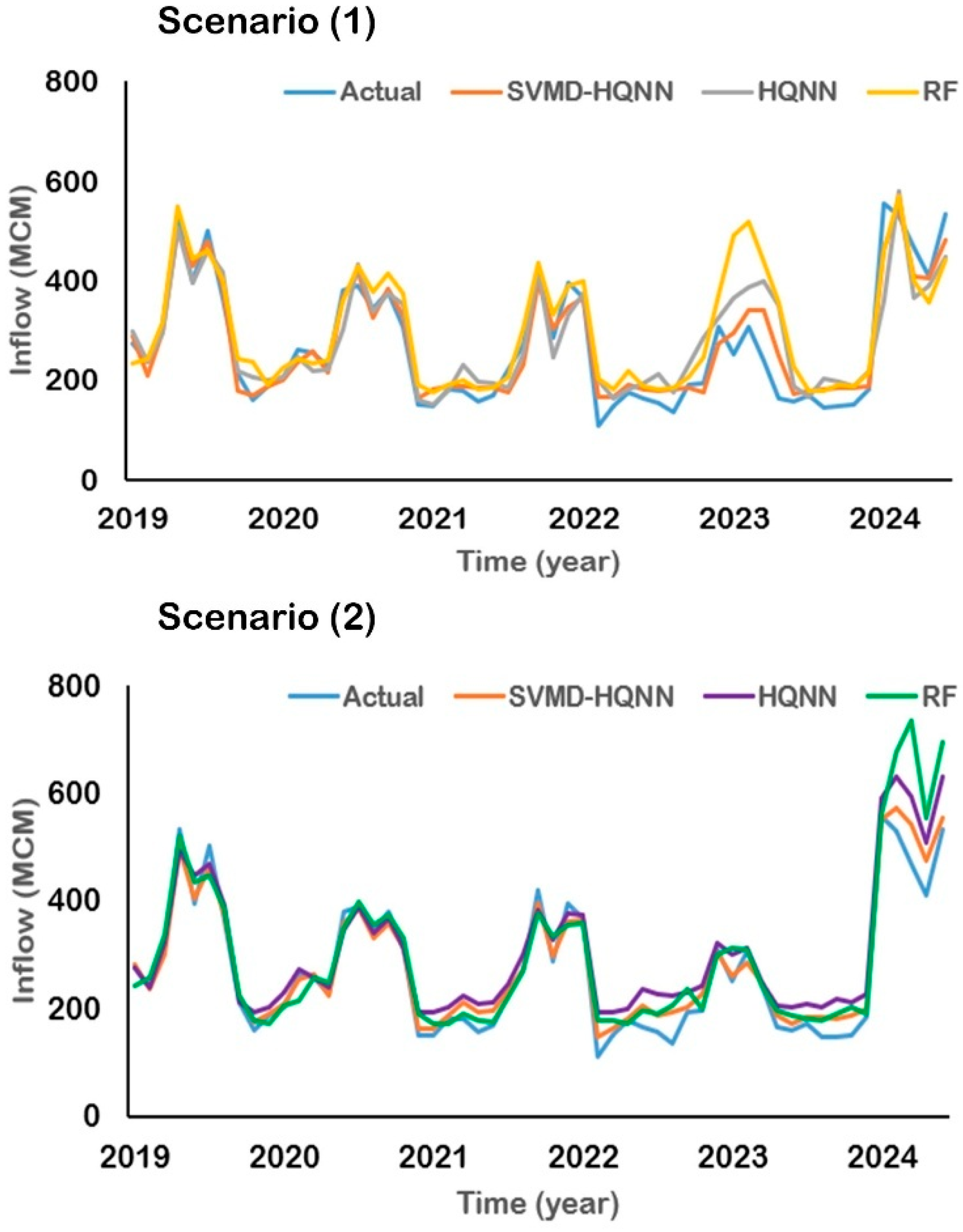 In scenario 1, SVMD-HQNN exhibits a sharp unimodal distribution closely aligned with the actual inflow (blue), particularly around the central peak (~300–400 MCM). This suggests high fidelity in capturing both the central tendency and dispersion of the observed data. HQNN shows a similar peak but with broader tails, indicating slight overestimation of extreme inflow events and reduced precision in low-probability regions. RF produces a flatter, more dispersed distribution, underrepresenting the peak and overestimating low inflow values (<200 MCM), which may reflect its tendency to smooth predictions and underfit nonlinear dynamics. Also, in scenario 2, SVMD-HQNN again demonstrates strong alignment with the actual inflow, capturing both the peak and tail behavior with minimal bias. The density curve suggests robust generalization under more variable conditions. HQNN retains a similar shape but shows heavier tails, implying increased uncertainty and reduced confidence in extreme predictions. RF diverges significantly, with a broad, low-amplitude distribution that fails to capture the observed peak. This may indicate poor adaptability to regime shifts or nonstationary inflow patterns.