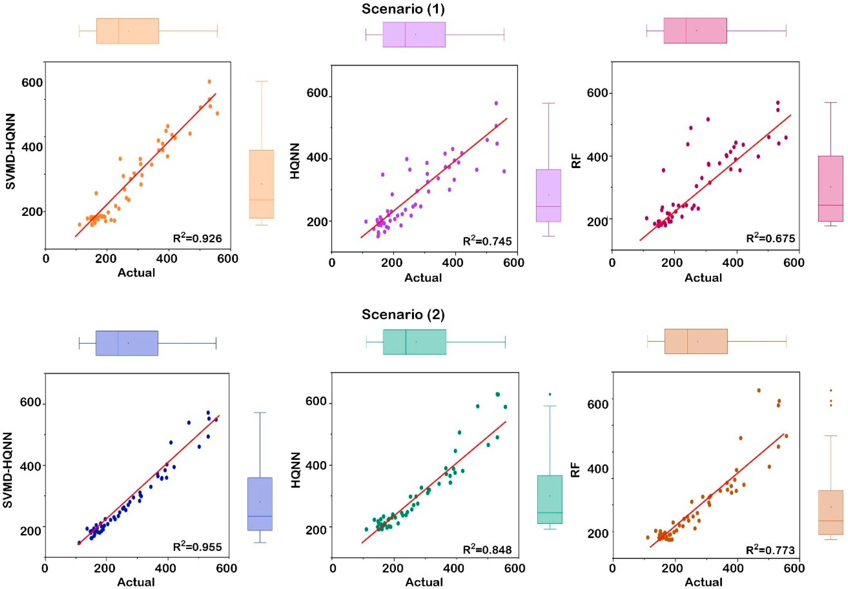 In Scenario 2, all models show improved predictive alignment. SVMD-HQNN achieves a near-perfect fit, with predicted points almost exactly on the regression line and an impressive R2 of 0.955. The boxplot illustrates extremely tight clustering, indicating both accuracy and stability with expanded features. HQNN significantly improves, with R2 = 0.848. Predicted values align closely with actuals, although a few points at high inflow magnitudes deviate. The boxplot suggests a more even distribution compared to Scenario 1, with reduced outliers. RF (bottom right) also benefits from the richer scenario, posting an increased R2 of 0.773. The scatter shows better concentration near the regression line, yet some points, especially at the upper inflow end, remain offset. The boxplot still indicates more variability relative to SVMD-HQNN and HQNN.
