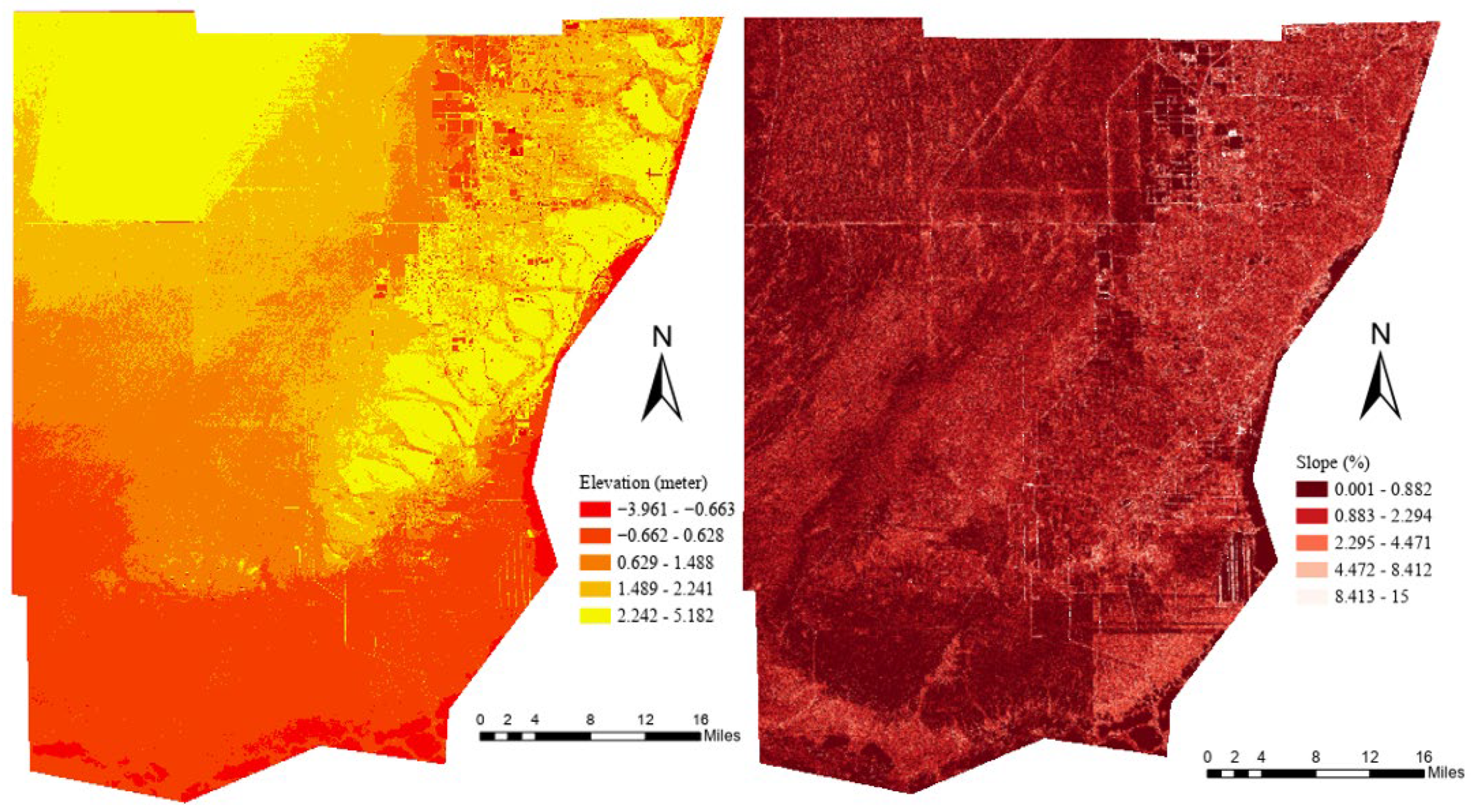 | Elevation | Elevation data have been derived from digital elevation models (DEMs), and elevation is negatively correlated with flooding [108,109]. As the elevation of Miami-Dade County is low, as illustrated in Figure 2, it is more susceptible to flooding. | |