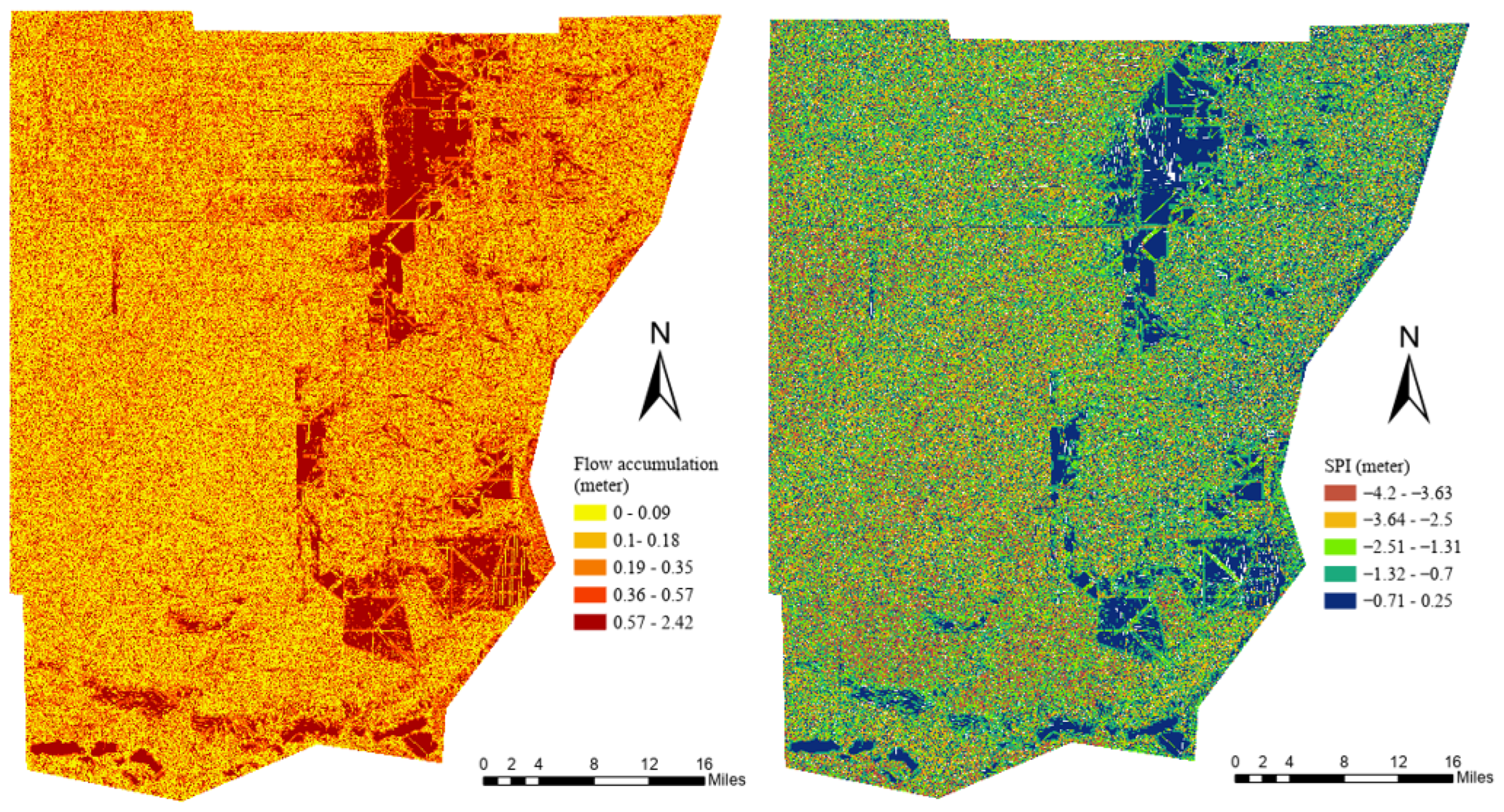 | SPI | Higher SPI values indicate greater erosive power and are more susceptible to flooding [114,115]. The stream power index is calculated using the Miami-Dade County digital elevation model, as illustrated in Figure 3. The SPI was calculated using Equation (1) [116,117]: | |